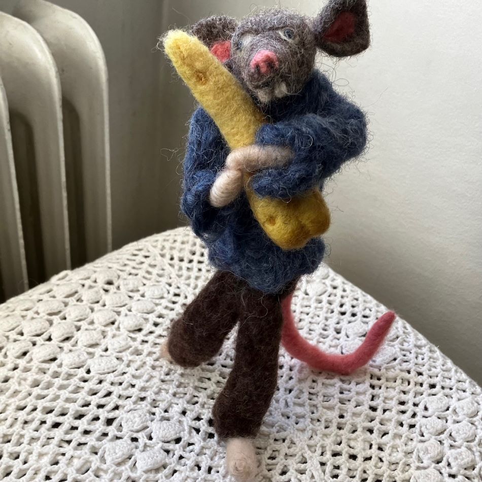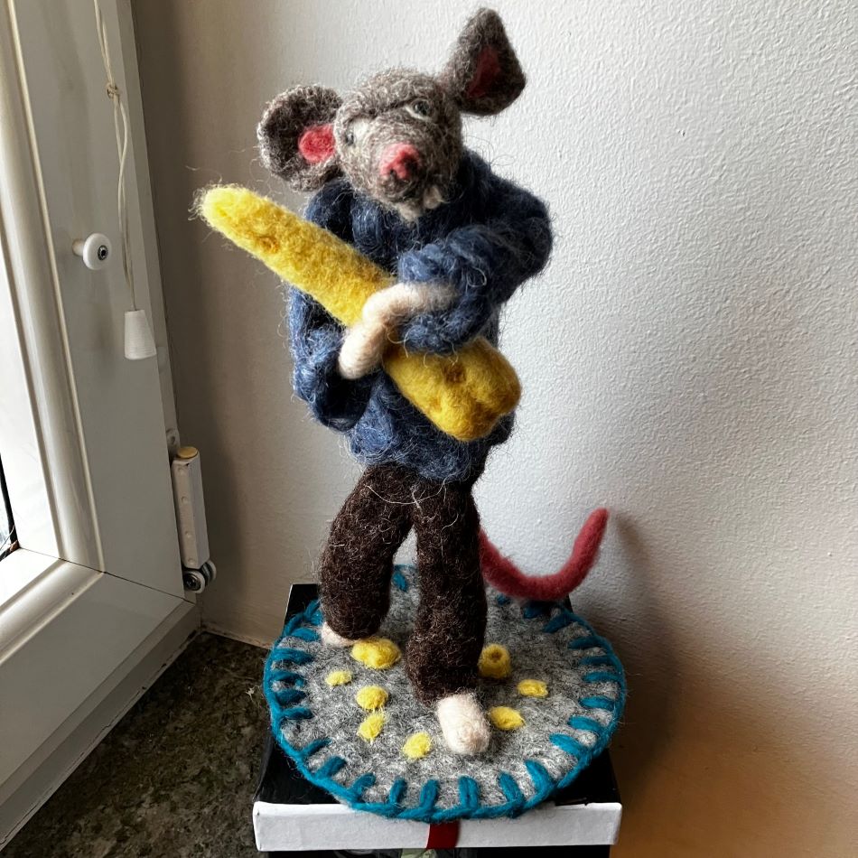 Ost tjuven, musen är nålfiltad och kroppen har en stålvajer i sig vilket gör att du kan välja att låta den stå eller sitta. Design Nettans UllisarUllmusen är cirka 20 cm hög.