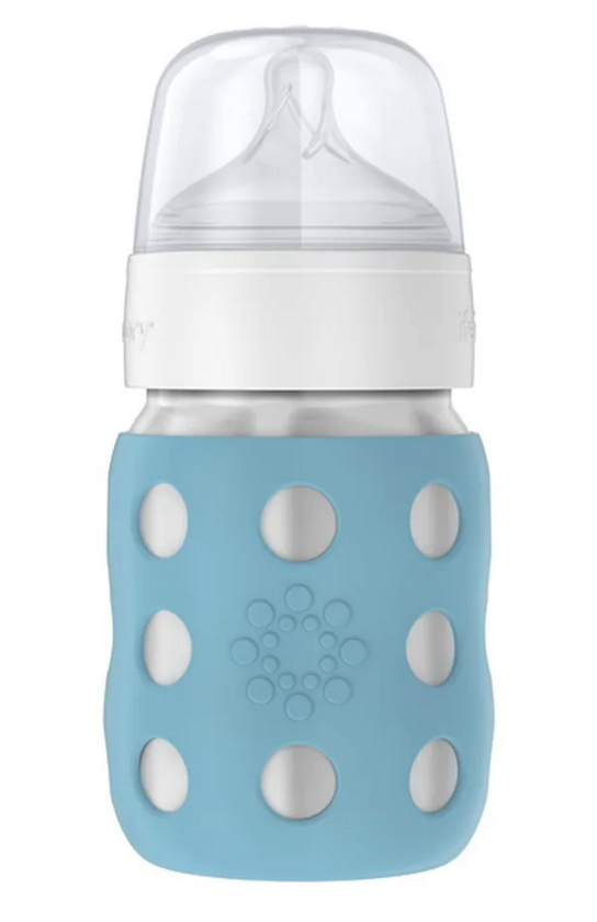 En smart och säker wideneck nappflaska av rostfritt stål från Lifefactory. Stål är ett bra alternativ till glasflaskor när man är ute på vift.