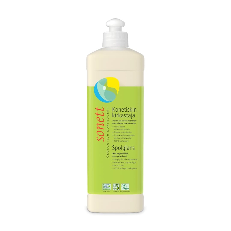 Naturlig spolglans för diskmaskinen från Sonett. En biologiskt nedbrytbar spolglans som förhindrar kalkavlagringar på glas och porslin. Spolglansens uppgift är att reducera ytspänningen för att det sista vattnet ska rinna av innan disken är färdig.