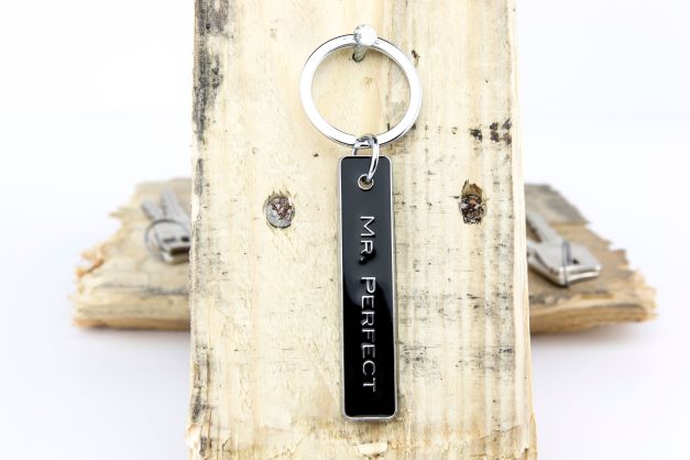 Nyckelring med text Mr Perfect i silver på svart bakgrund. Den är gjord i blankpolerad metall, med svart emalj och text på framsidan.