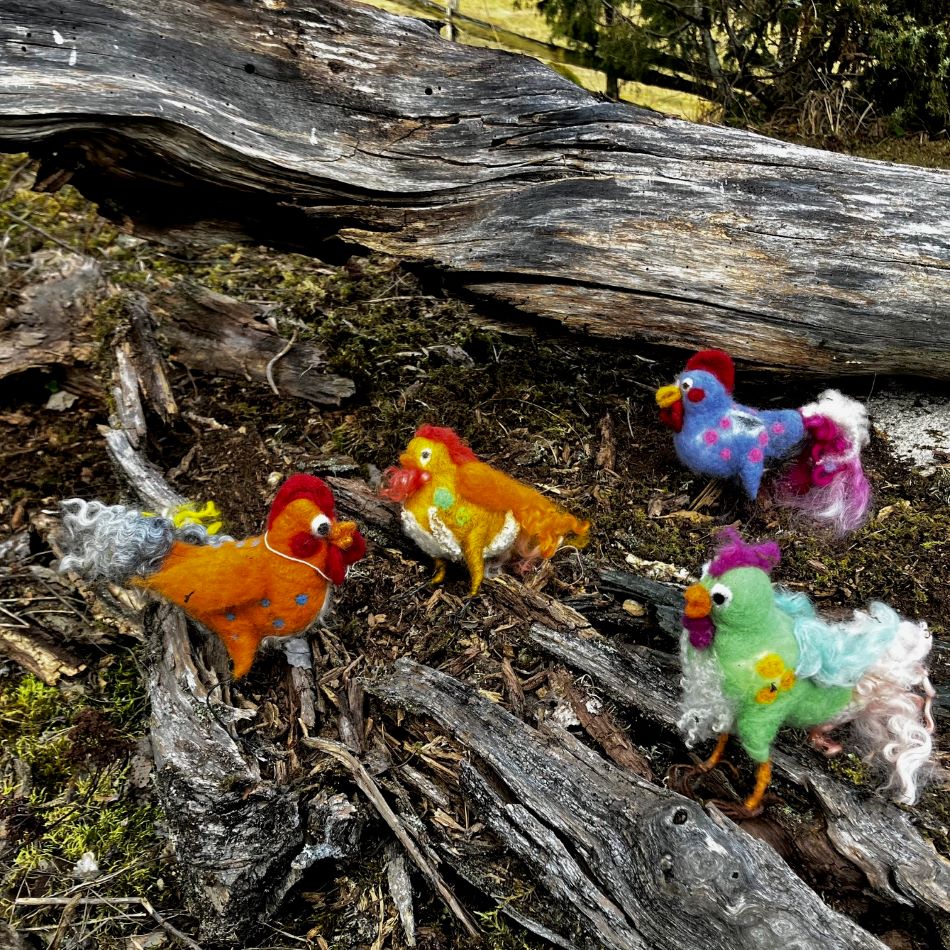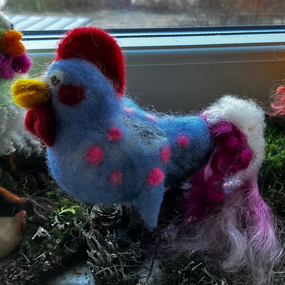 åskkyckling nåltovad i svensk ull med ben av ståltråd. Handgjord design av Nettans Ullisar. Fjädrar är lockar från leicesterfår som är handfärgade med ekologisk färg. Du kan dekorera krukor, fönster eller sy igenom ett band och hänga kycklingen (hönan). Finns endast en unik kyckling men jag kan alltid göra fler i liknande färger. Skicka meddelande om du vill ha flera kycklingar i blå färg. Påskkycklingen väger cirka 30 gr.