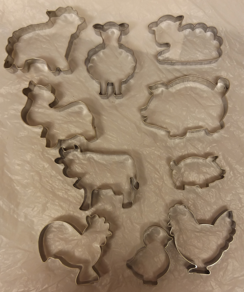 Pepparkaksformar bondgårdsdjur kan du välja mellan: Får framifrån, Får liggande, Får sidan, Gris liten, Gris stor, Gås, Häst liten, Häst stor, Höna, Katt lekande, Katt liten, Ko mullig, Kyckling eller Tupp.