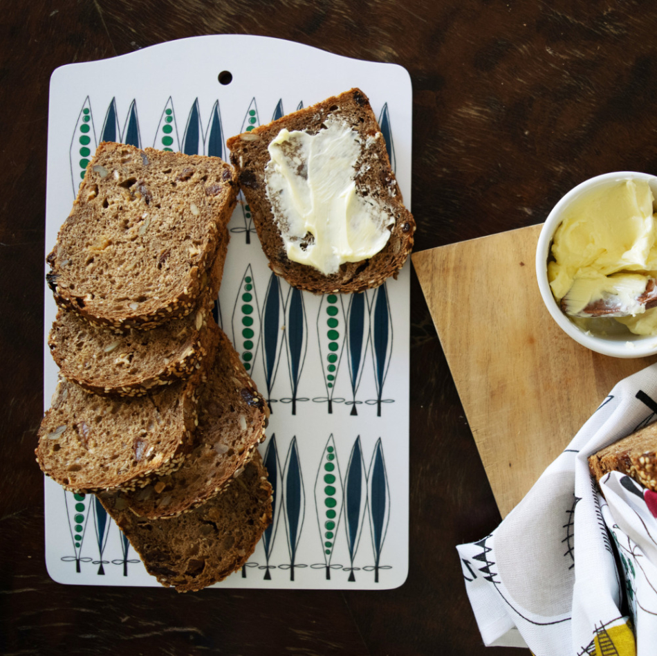 Uppläggningsbräda i trä med delar ur mönstret Picknick i blå multi. Passar fint för uppläggning av bröd eller varför inte skapa en liten ö på bänken och samla olivolja, kryddor mm på. Uppläggningsbrädan är försedd med ett hål för att enkelt kunna hängas upp på väggen.
