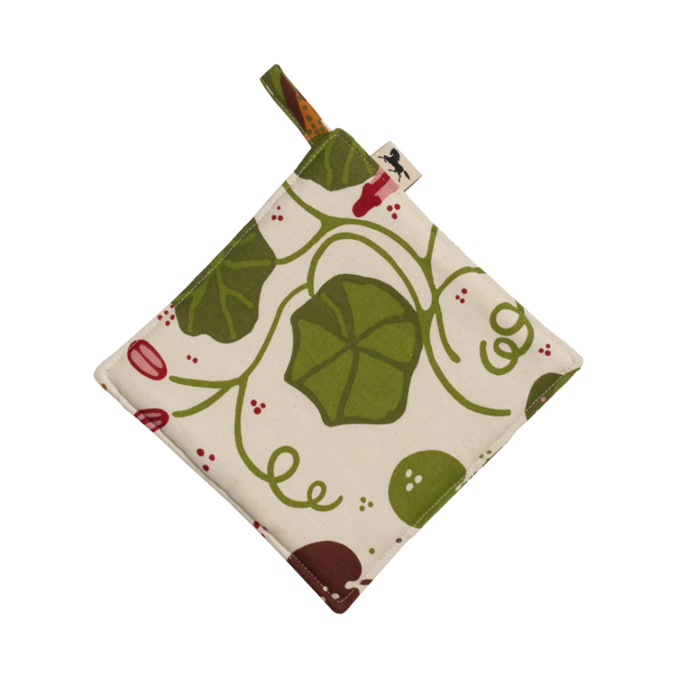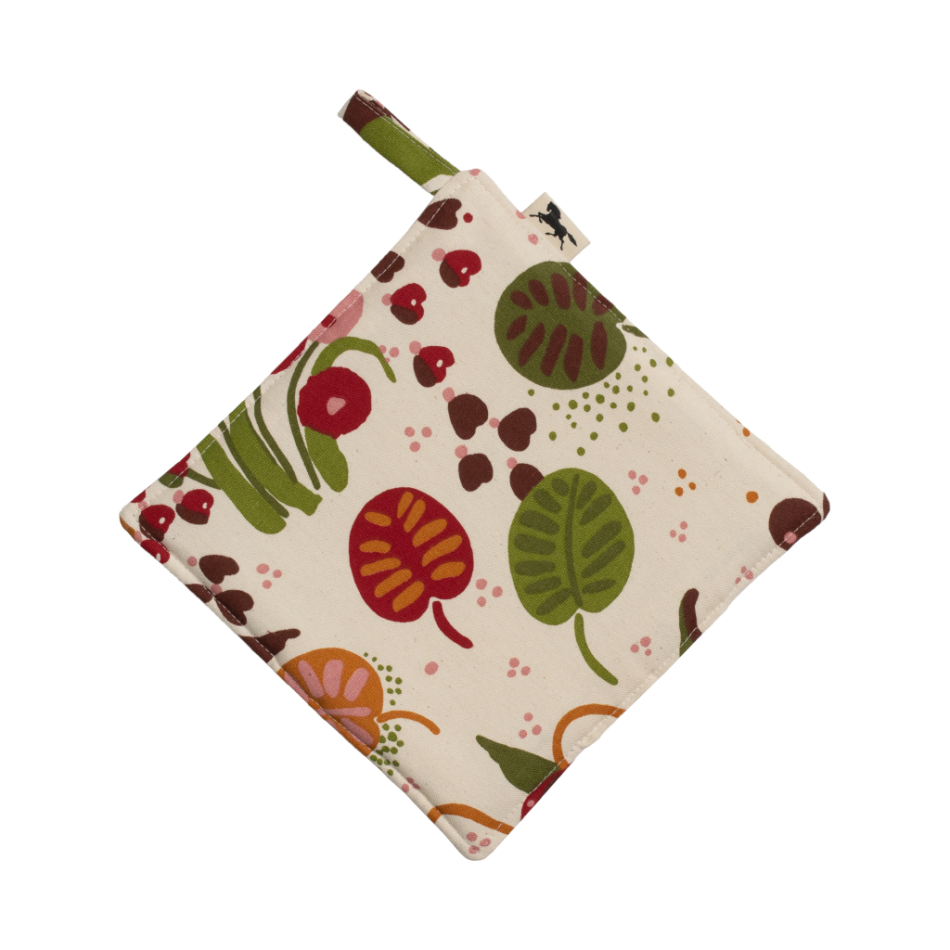 Ett härligt och storskaligt blommönster med ett klassiskt uttryck designat på 1970-talet. Mönstret är tryckt på grytlappens fram- och baksida med 64 cm mönsterrapport. Varje enskild grytlapp är unik och mönstrets placering varierar mellan produkterna.