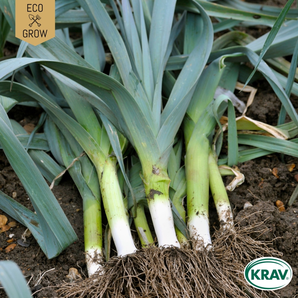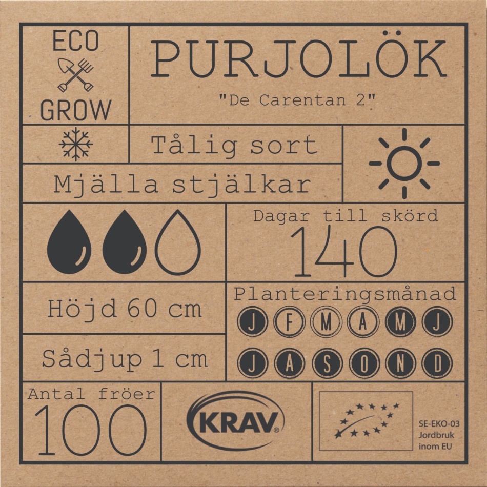 Purjolök De Carentan 2 - är en odlingssäker sort med täta, höga och kraftiga stjälkar och ett grönt utbrett bladverk. Är köldtålig och kan skördas från tidig höst fram till mars året därpå. Täck plantorna med halm under vintermånaderna för att inte frysa fast. Används färsk eller i matlagning.