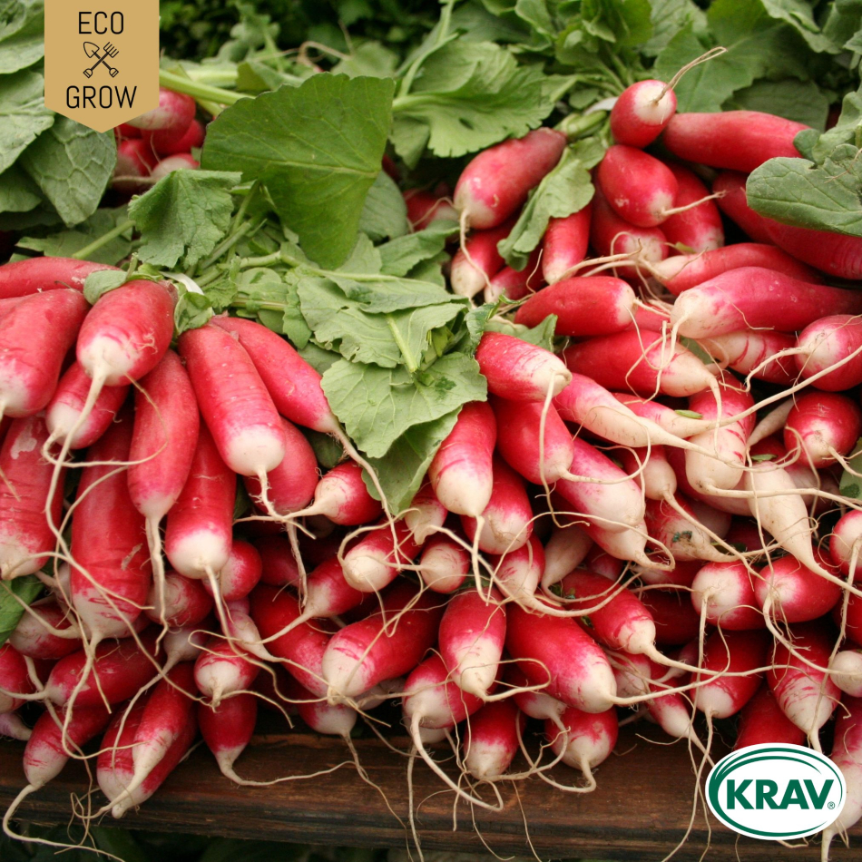 Smakfull, avlång sort med rosa yttre och vit nederdel. Mild och krispig smak. Låt den inte förväxa, risken är att den blir svampig. Fantastiskt god skivad på smörgås eller i sallader.