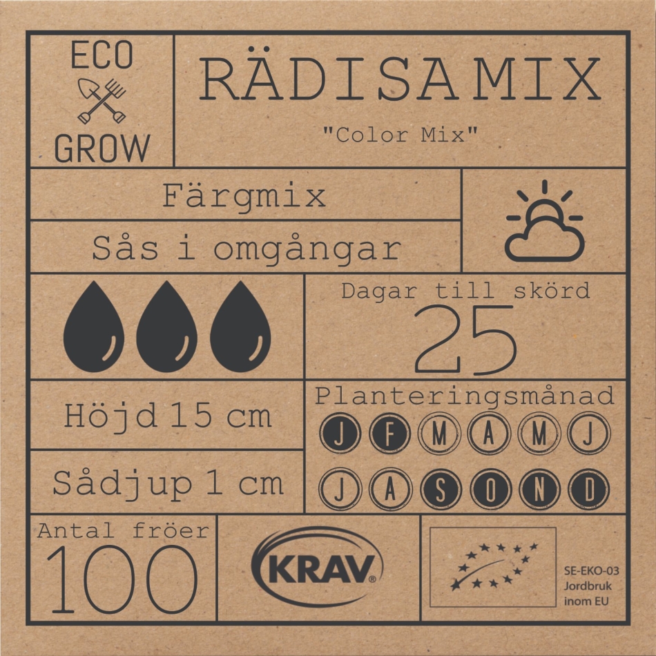 Direktsådd: Så fröna 1 cm djupt på växtplatsen när jorden reder sig. Sås och skördas under hela sommaren. Vattna rikligt för att undvika beska. Lämpar sig även för kallsådd på vintern.