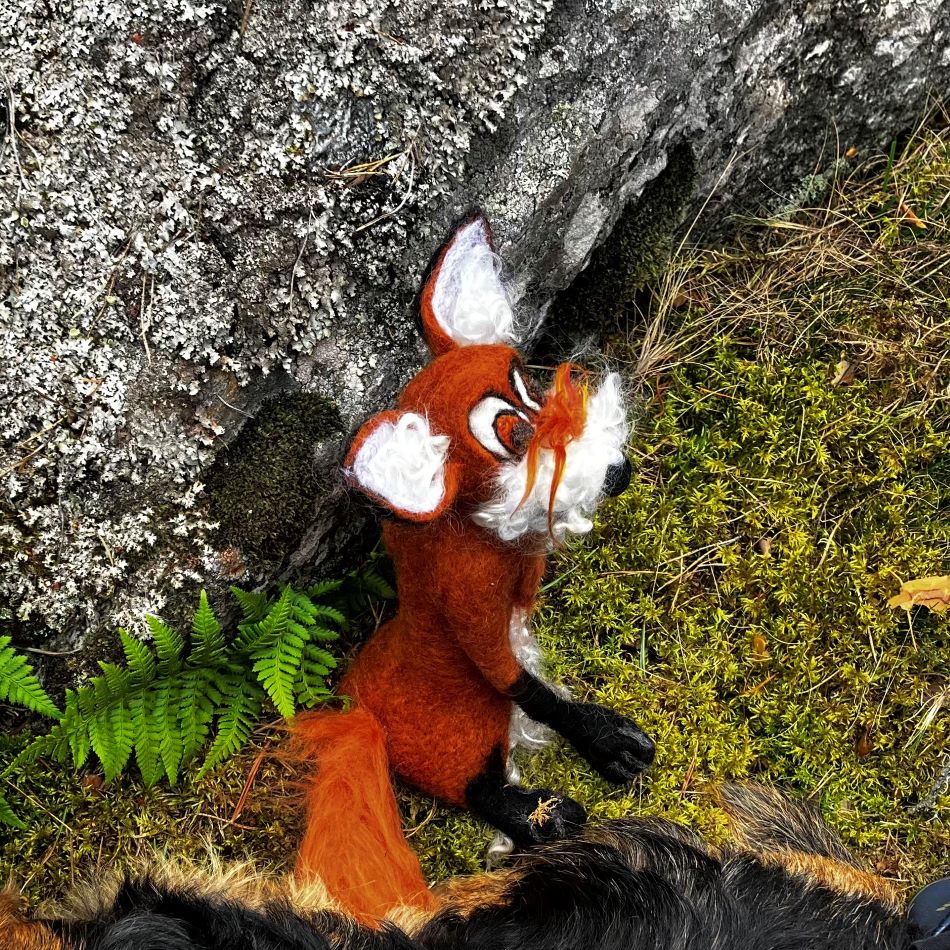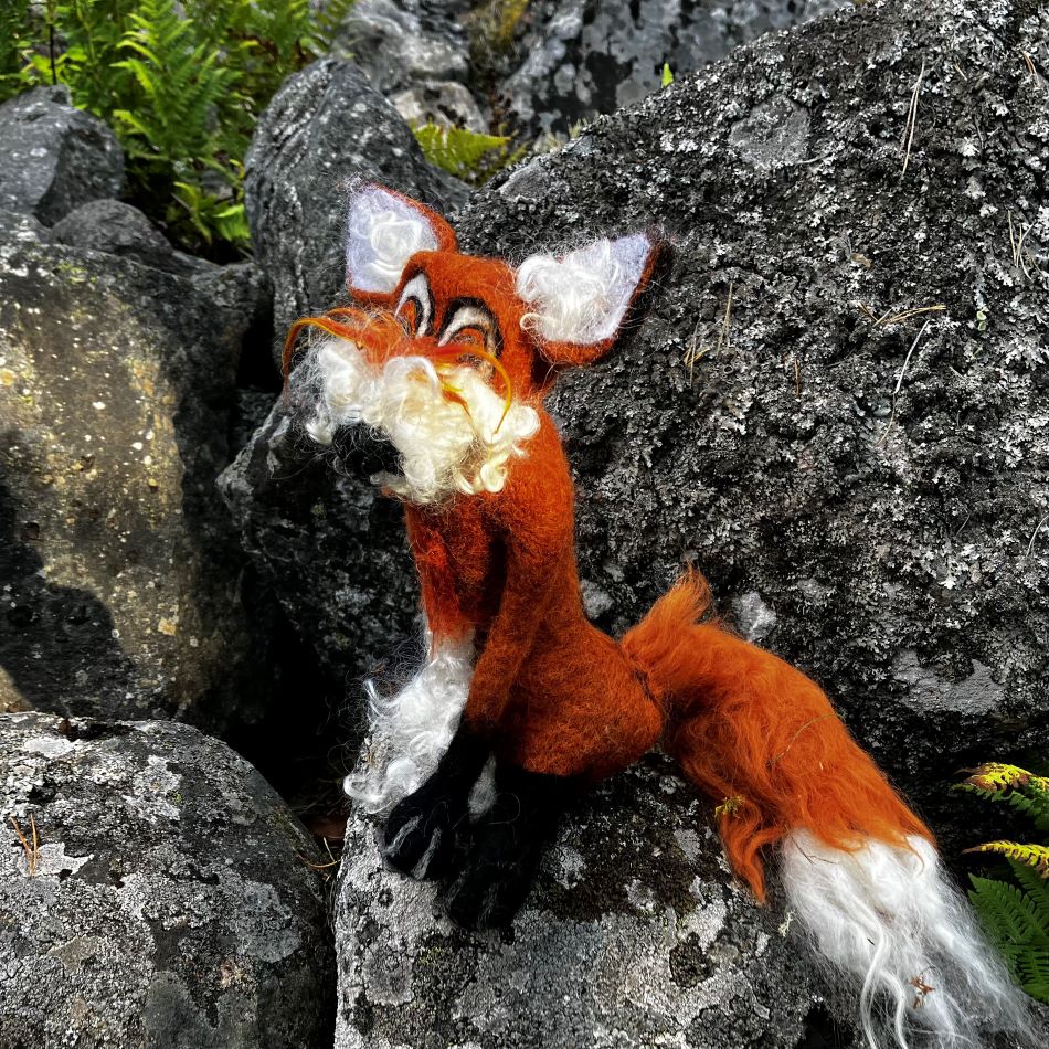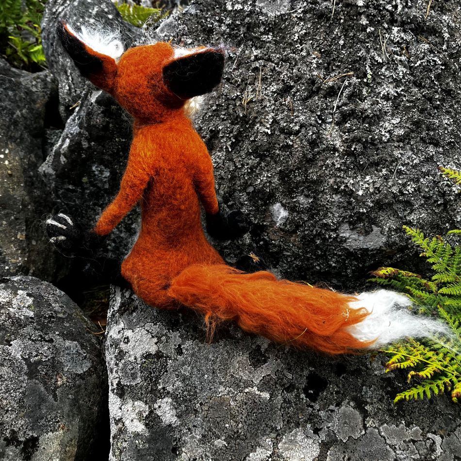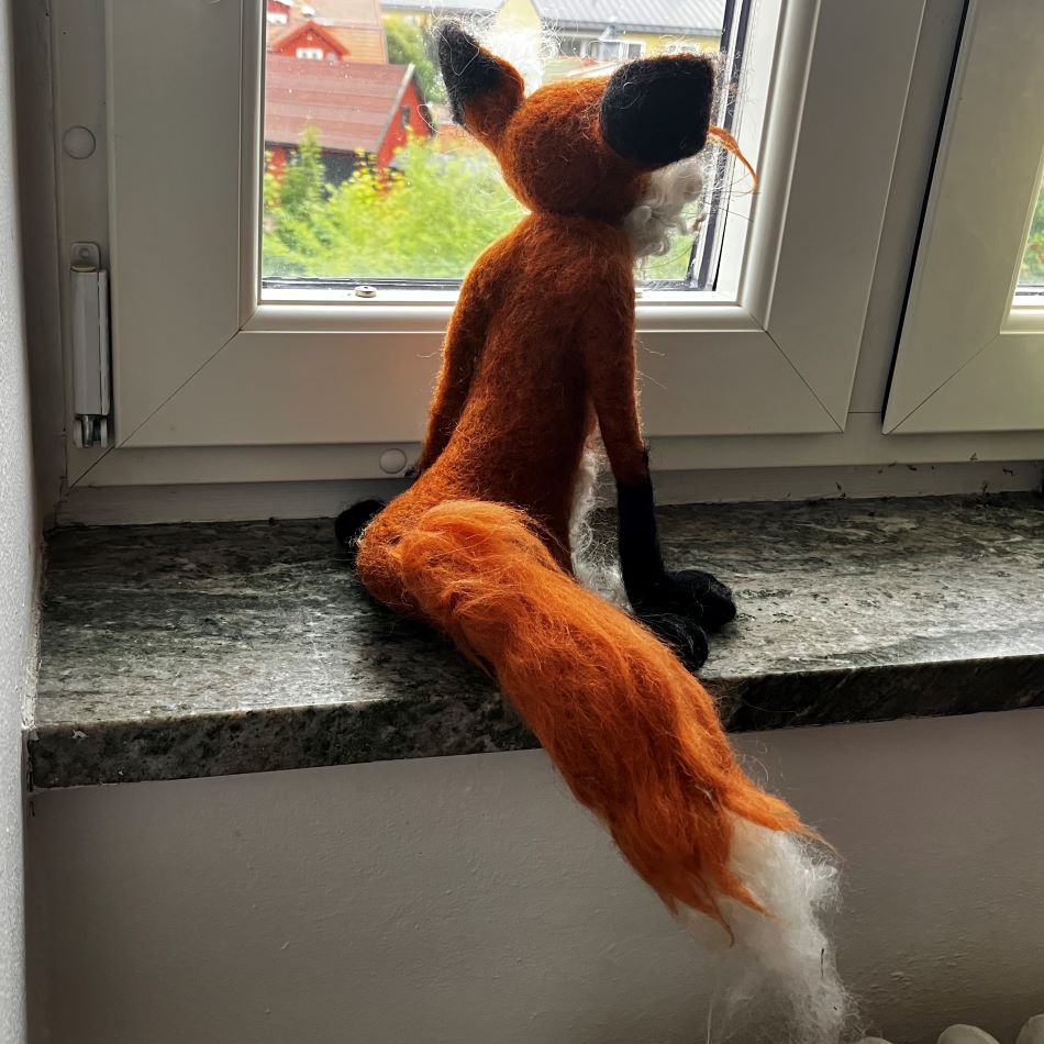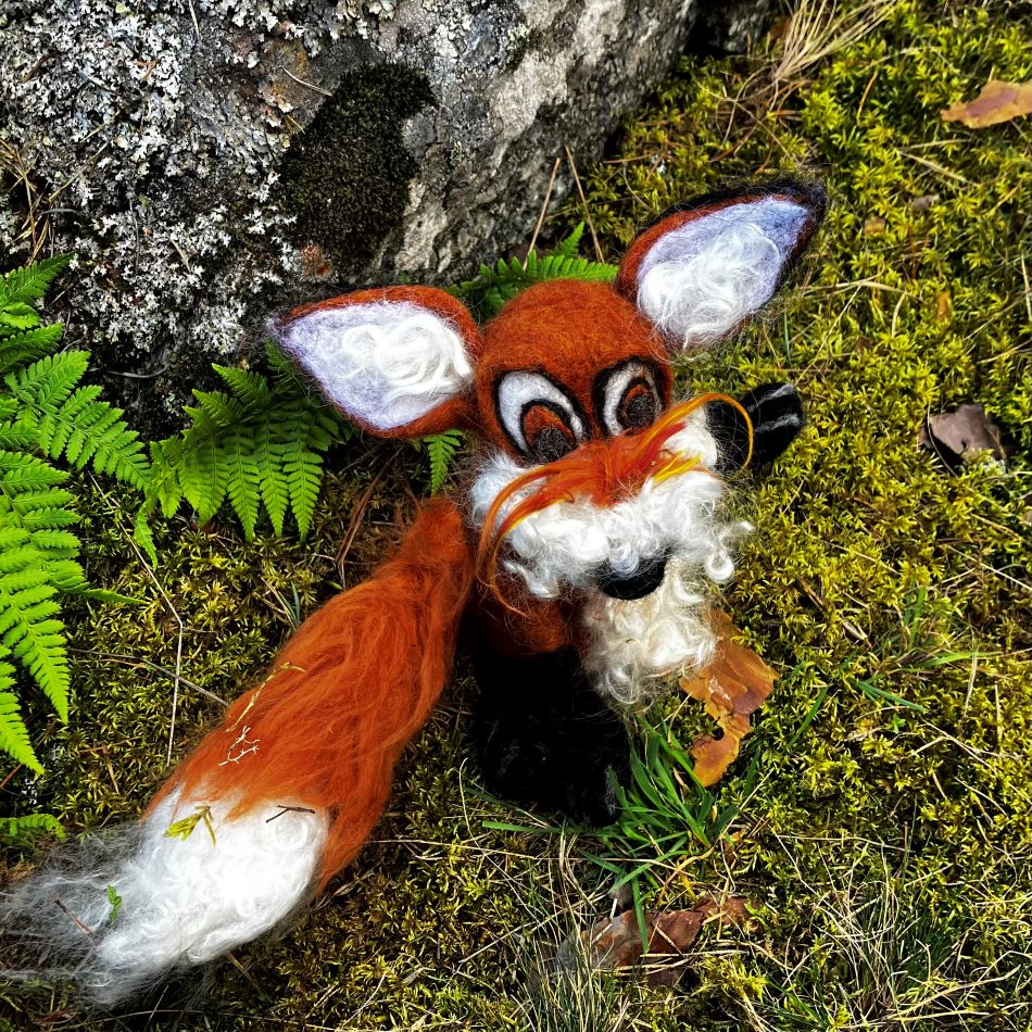 Mickel räv är cirka 25 cm hög och väger 120 gr. Kroppen är svensk ull (gotlandsfår) och den vackra rävfärgen är från corriedalefår. Lockar av fårpäls är från leicesterfår som betat i Roslagen. Mickel räv är en fin dekoration i fönstret, på bokhyllan eller som present till någon som tycker om det lite annorlunda hantverket nålfiltning, tovning.