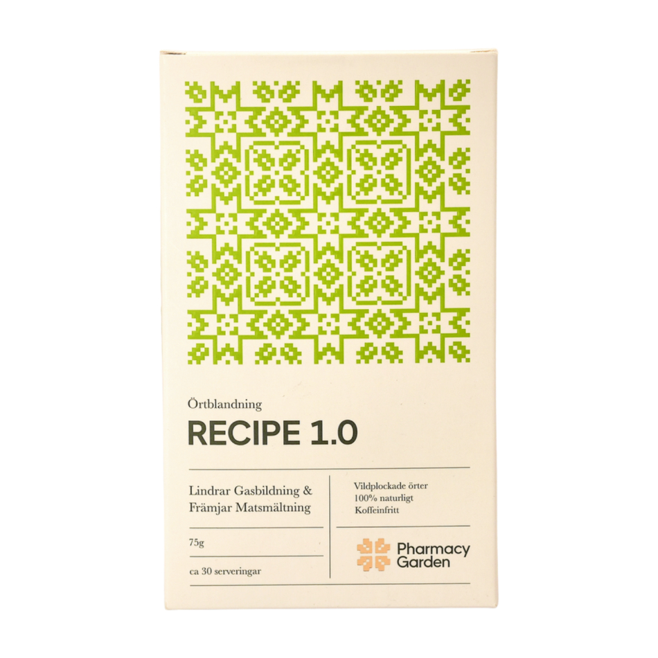Ingredienserna i Recipe 1.0 är noggrant utvalda för att effektivt lindra gasbildning och främja en sund matsmältningsprocess. Produkten intas vid behov för bästa resultat.