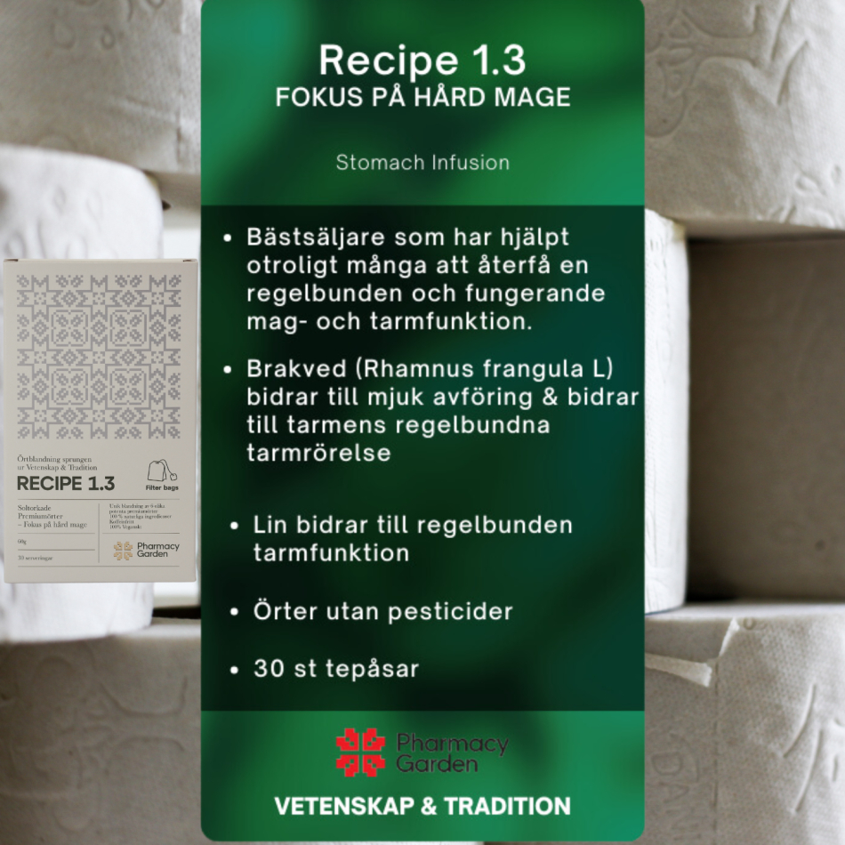 Med sina noggrant utvalda örter främjar Recipe 1.3 en regelbunden tarmrörelse och optimerad tarmfunktion. Denna premiumörtlösning består av sex olika örter av den absolut högsta kvaliteten, vilket resulterar i en unik och effektiv sammansättning.
