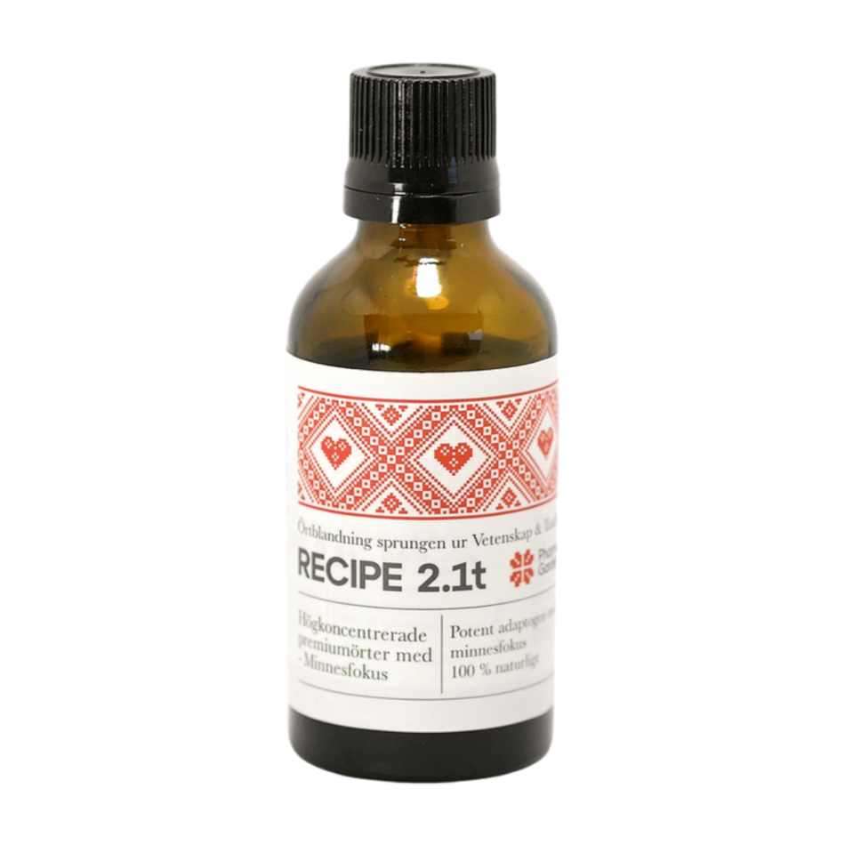 Recipe 2.1t - Minnesfokus är ett flytande örtextrakt med väldokumenterade örter sprungna ur vetenskap & tradition. Recipe 2.1t innehåller Grekiskt bergste (Sideritis). Sideritis kan direktöversättas från grekiskan till "Han som är gjord av stål". Idag bedrivs mycket forskning kring Sideritis och dess effekt på hjärnan.