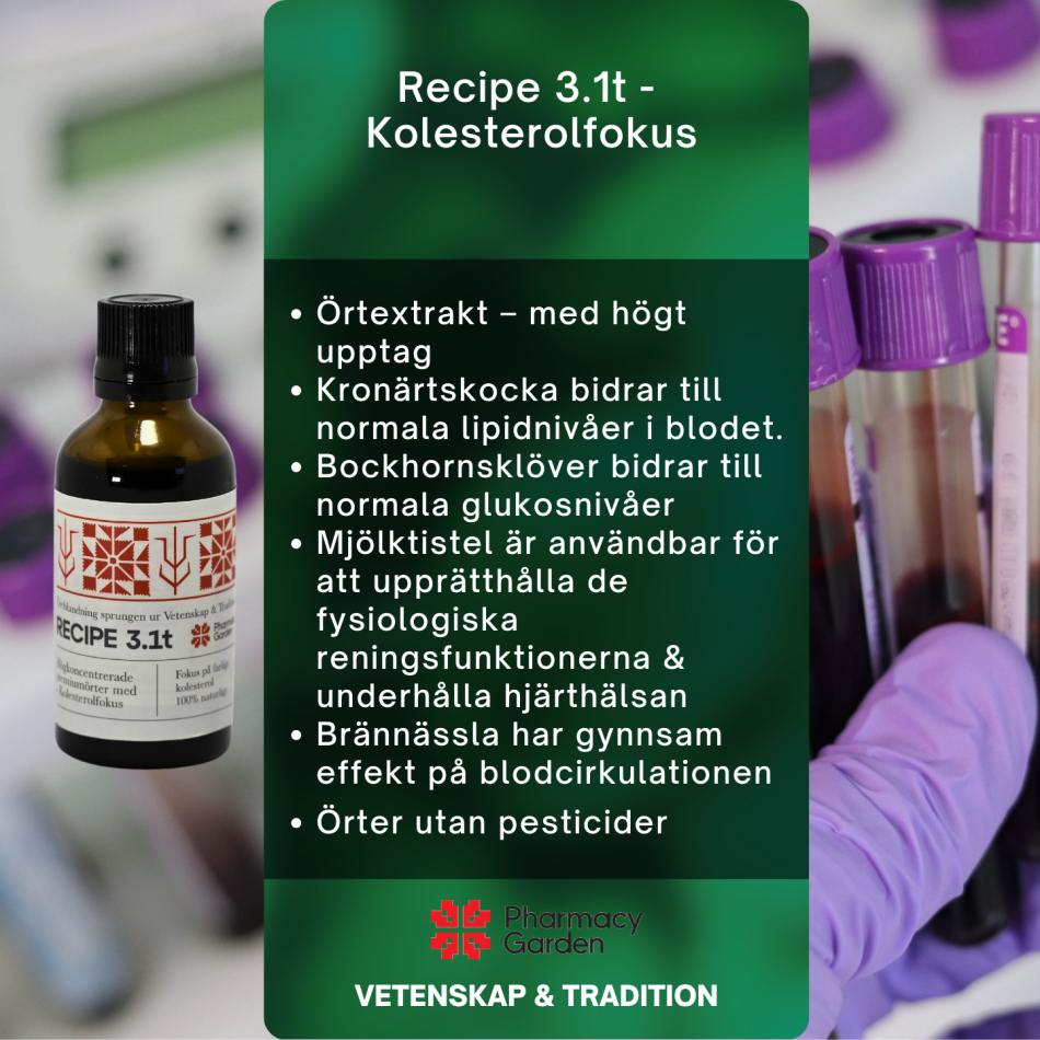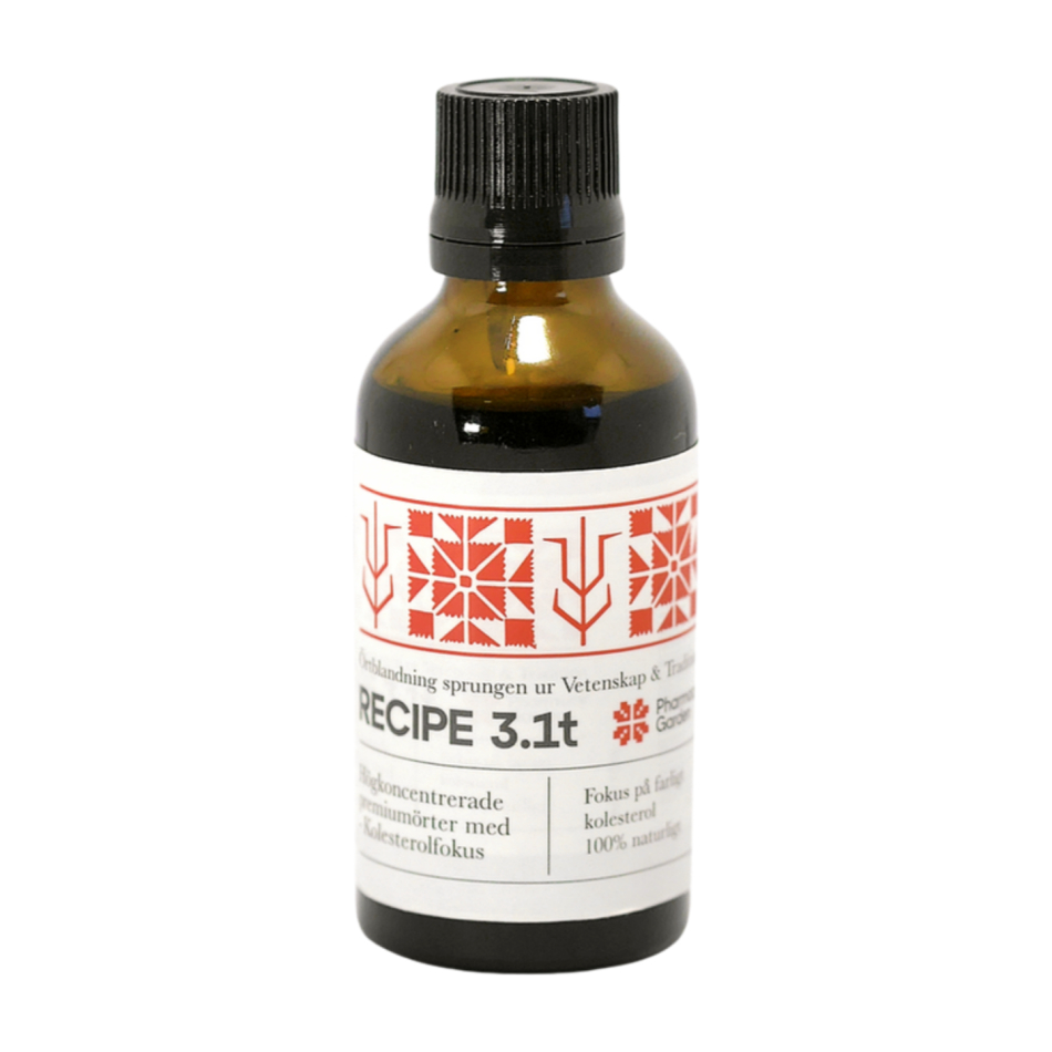 Recipe 3.1t är ett flytande örtextrakt som förenar vetenskap och tradition genom noggrant utvalda örter. Det som särskiljer Recipe 3.1t är dess unika sammansättning, där ingredienser som Kronärtskocka, Bockhornsklöver, Mjölktistel och Brännässla harmoniskt samverkar.