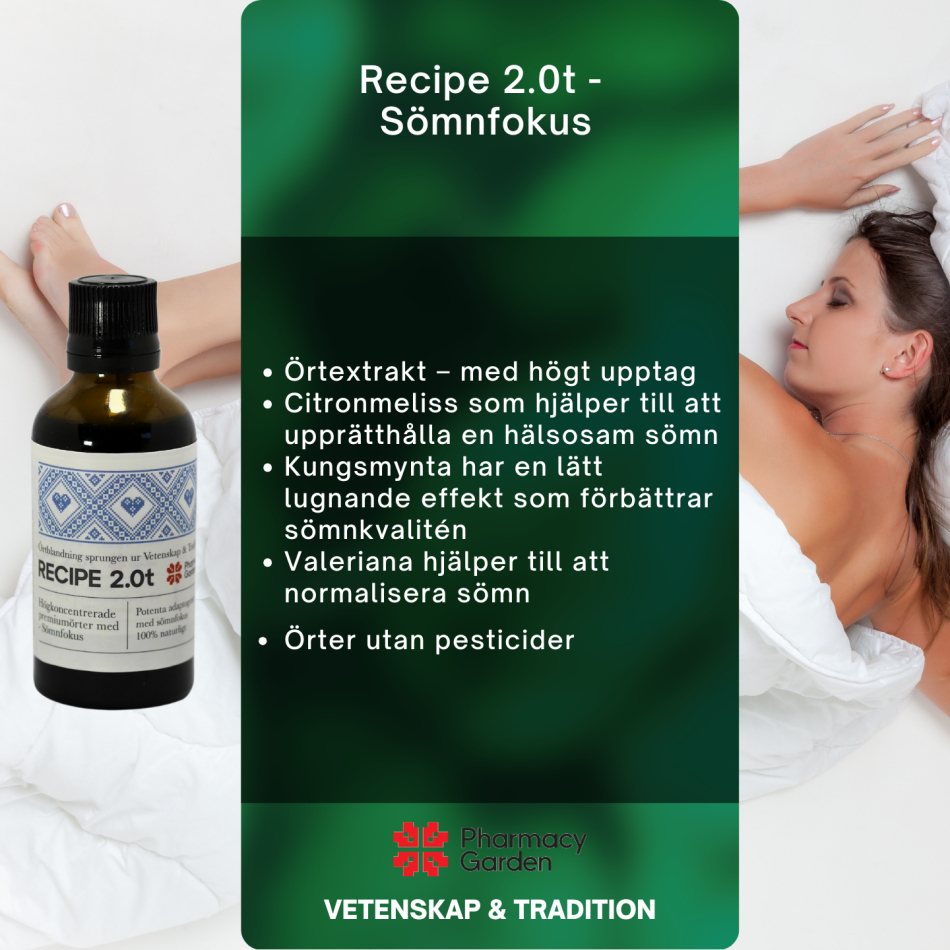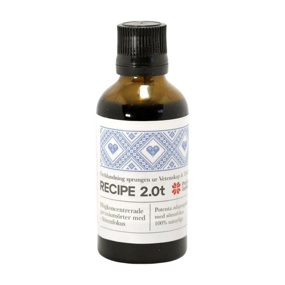 Recipe 2.0t är en flytande örtextrakt med väldokumenterade örter som förenar vetenskaplig forskning med traditionella insikter. Citronmeliss är en av de ingredienser som återfinns i Recipe 2.0t och har potential att stödja normal avslappning, samt Valeriana.