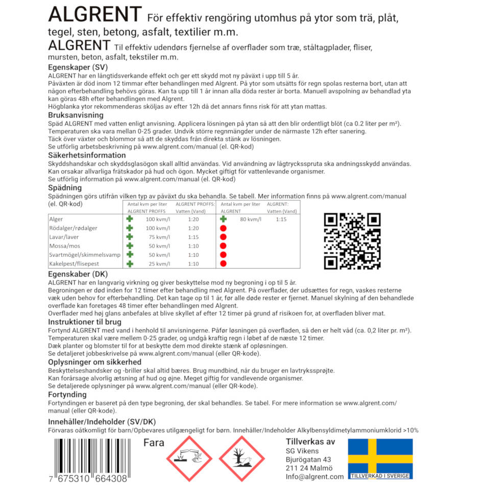 - 1 liter koncentrat av ALGRENT räcker upp till 80 m². Ger upp till 16 liter högeffektivt rengöringsmedel.