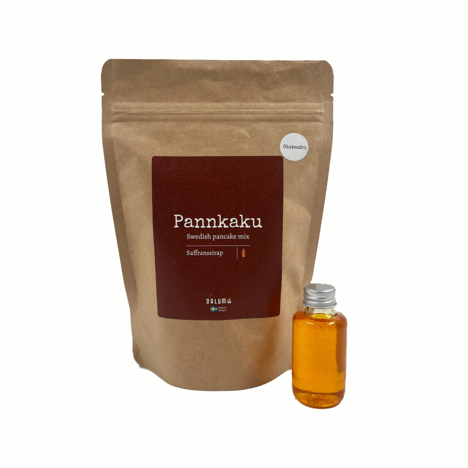 Naturell pannkaksmix och en flaska saffransirap som du serverar till de nygräddade pannkakorna. Sirapen tillverkas på ett hantverksmässigt sätt av Dalum själva.