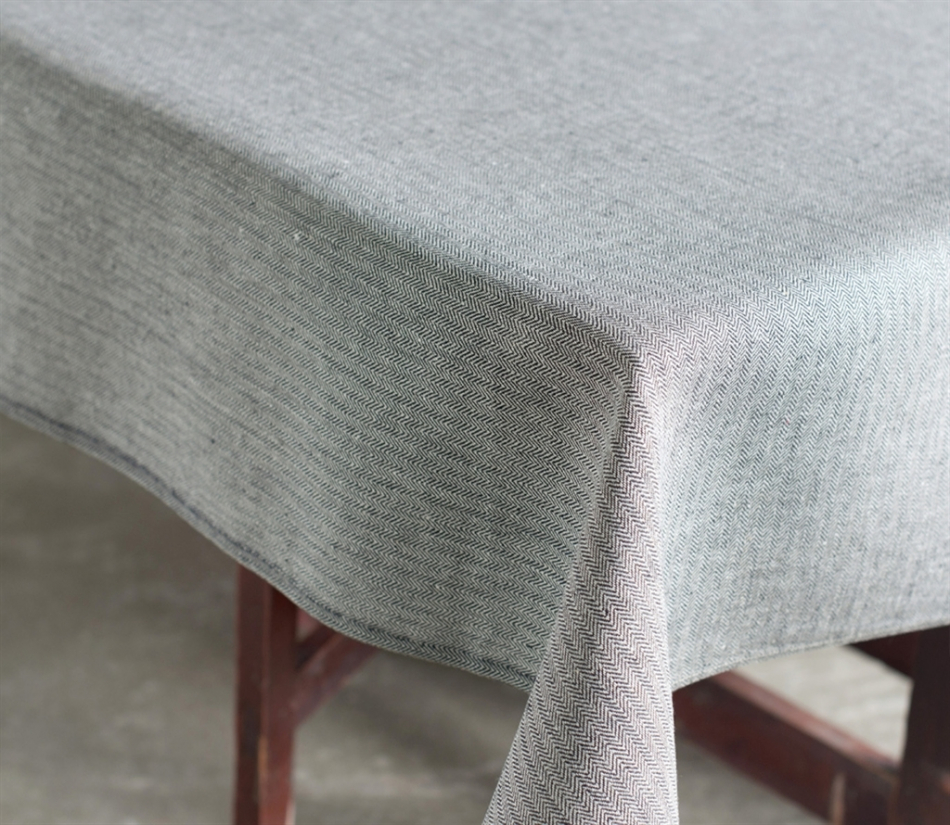 En lättanvänd opretentiös linneväv. Oblekt varp och kulört inslag ger, med ett litet fiskbensmönster, liv åt ytan. Tacksam att duka på, både till vardag och fest. Denna duk är utmärkt att kombinera med en festremsa eller löpare över.