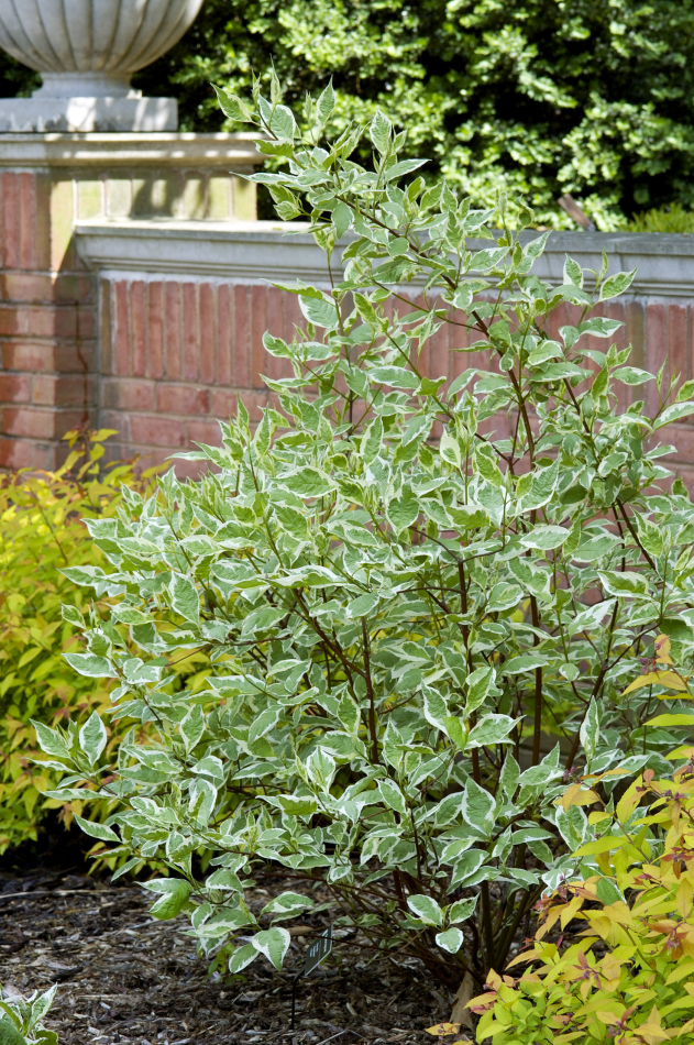 Cornus alba 'Elegantissima'. Vitbrokig (rysk) kornell odlas för sitt vitbrokiga bladverk som lyser upp i trädgården.