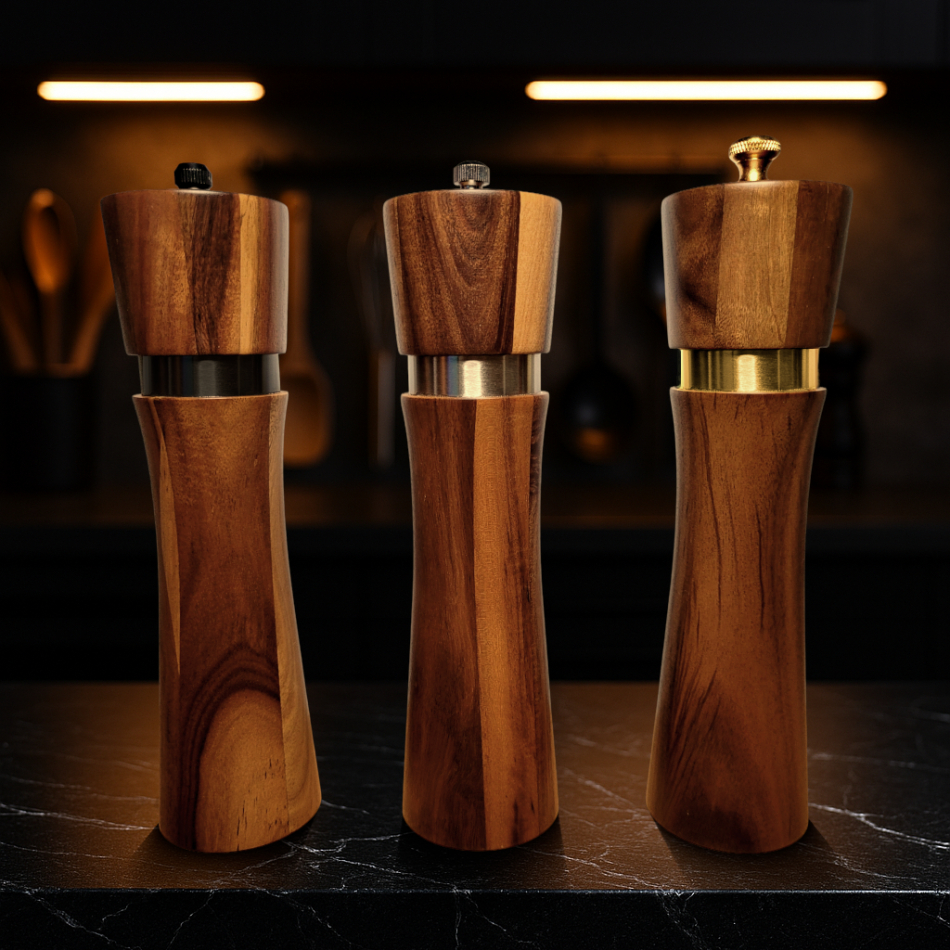 Tillverkade av massivt akaciaträ med keramisk rotor och detaljer av rostfritt stål, ingen plast.