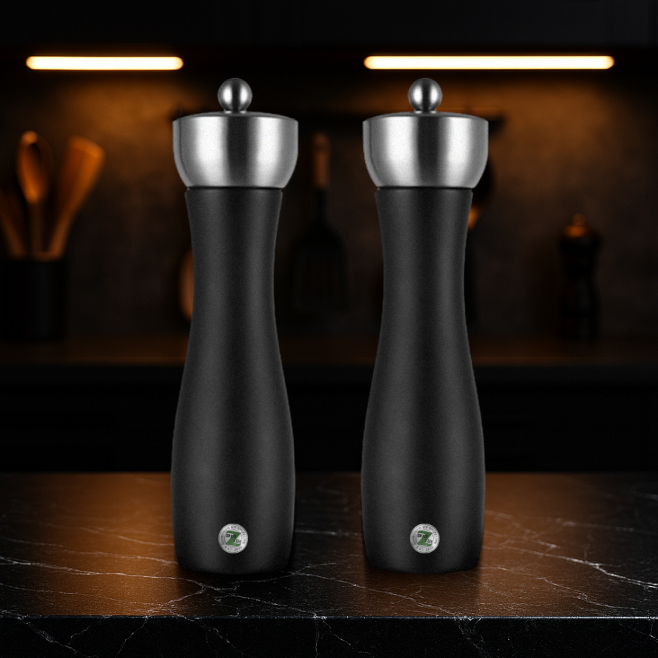 Tillverkade i massivt trä med keramisk rotor och detaljer av rostfritt stål, ingen plast.