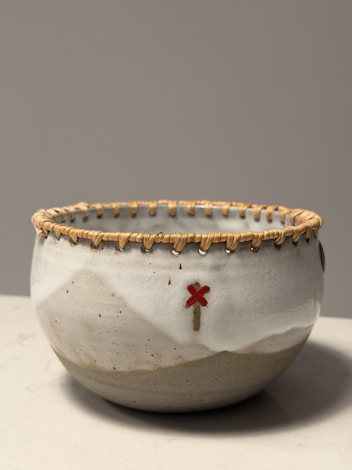 Skål i serie fjäll. Kant av björkrot. Dekor ledkryss.