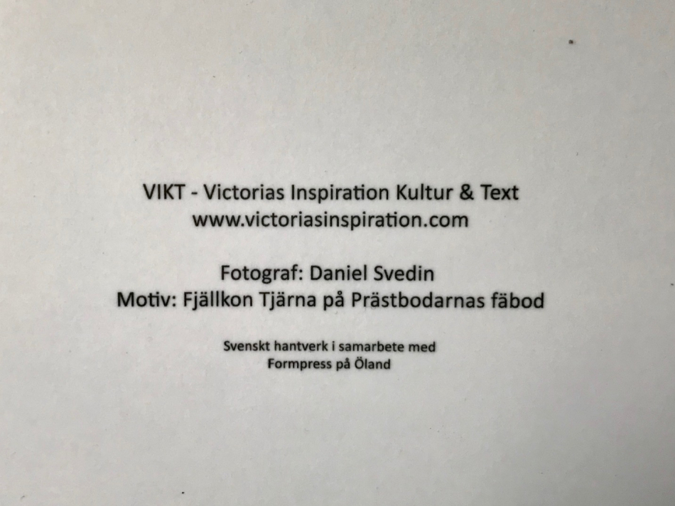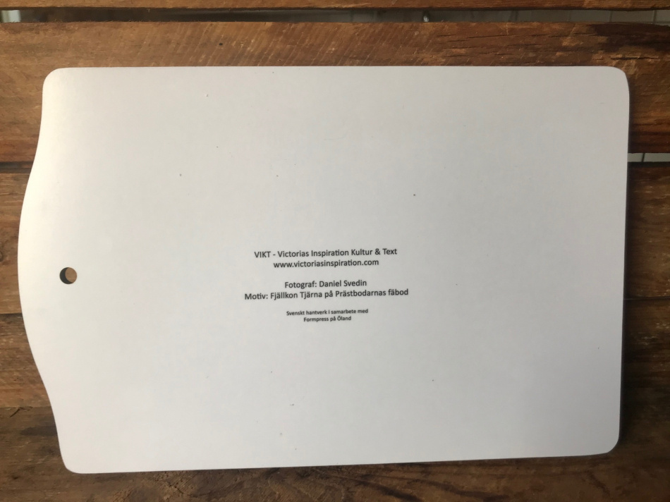 Praktisk, vacker skärbräda 30 x 20 cm med litet upphängningshål. Ska ej maskindiskas eller ligga i blöt. Tillverkad av MDF (Medium Density Fibreboard) från Formpress på Öland som har miljötänk i sin framställning. www.formpress.com Motiv: fjällkon Tjärna på Prästbodarnas fäbod, Rättvik (som det även finns barnböcker om). Foto: Daniel Svedin. Framtagen av VIKT - Victorias Inspiration Kultur & Text.
