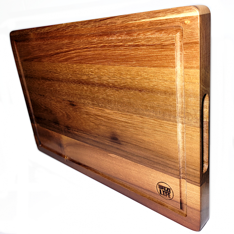 Rejäl skärbräda med saftskåra och handtag. Tillverkad av slitstarkt akaciaträ vilket ger lång livslängd. Alla skärbrädor har unik trästruktur.