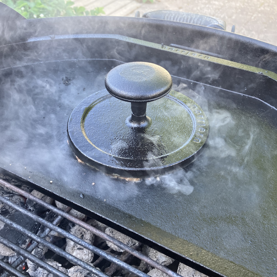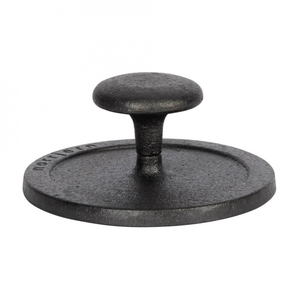 Vår hamburgerpress är tillverkad av högkvalitativt gjutjärn för långvarig hållbarhet och en behaglig känsla vid användning. Den tunga konstruktionen ger den nödvändiga tyngden för att skapa perfekta hamburgare och fungerar även som en effektiv grillpress.