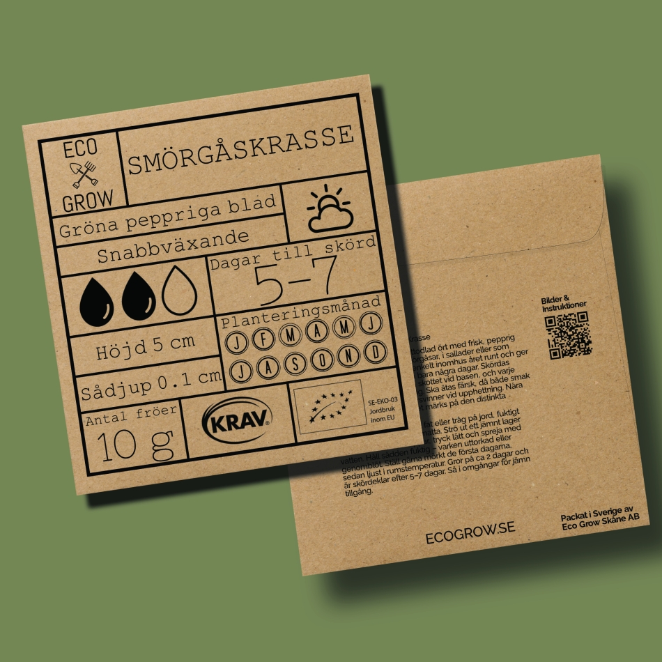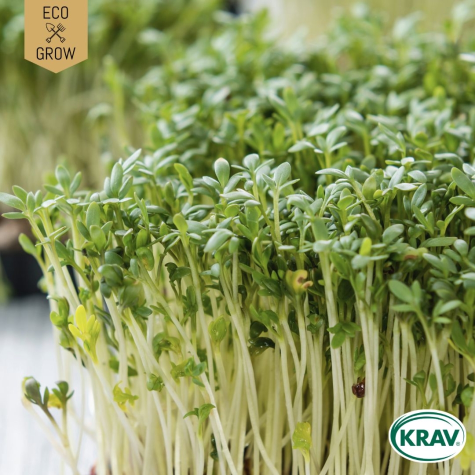 Är en snabbväxande och lättodlad ört med frisk, pepprig smak – perfekt på smörgåsar, i sallader eller som garnering. Den odlas enkelt inomhus året runt och ger en näringsrik skörd på bara några dagar. Skördas genom att klippa hela skottet vid basen, och varje planta skördas en gång. Ska ätas färsk, då både smak och näringsämnen försvinner vid upphettning. Nära släkt med senap, vilket märks på den distinkta smaken.