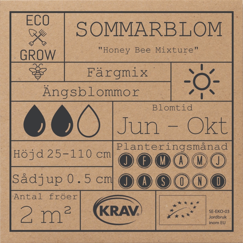 Är en ängsblandning av vackra sommarblommor som är särskilt utvalda för att attrahera och gynna pollinatörer. Har en lång blomtid och ger fin blomprakt hela sommaren. Denna mix innehåller bla. bovete, honungsfacelia, gurkört, ringblomma, rosenskära, blåklint, prästkrage, kornvallmo, oregano och dill.