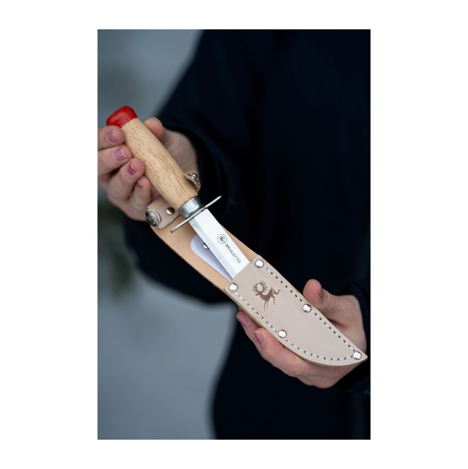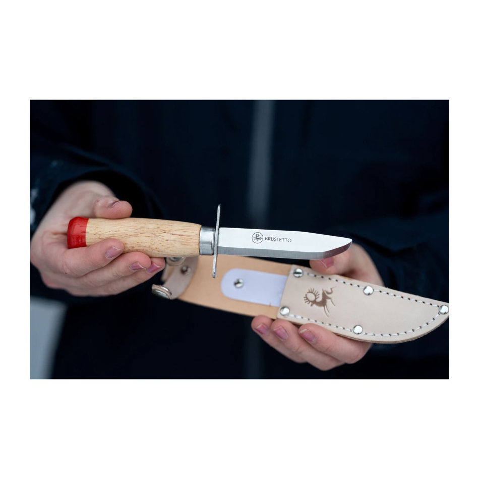 Barnkniv med trubbig spets. Parergrepp (fingerskydd) vid knivbladet. 3Cr13 stål i knivbladet som är lätt att skärpa upp igen. Lackerat trä i skaftet. Brusletto Speider Liten är en kniv vi har gjort för de allra minsta. Kniven har skaft i lackerat trä och knivblad av rostbeständigt knivstål. Speider liten har en skandinavisk rakslipad egg med trubbspets och slida i läder. Skaftet är utformat för att passa små händer och kniven har dubbelt parergrepp. Total längd: 15,6 cm. Bladlängd: 8,1 cm.