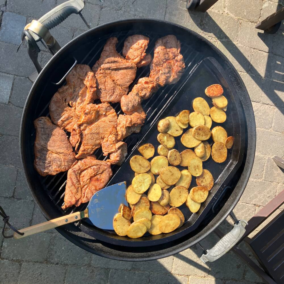 Stekbordets kanter förhindrar fett och olja från att droppa ner på glöden i grillen, vilket minskar risken för oönskade bismaker. Du kan också förbereda tillbehör eller värma brödhalvor på den andra halvan av grillen medan du lagar mat på Stekbordet.