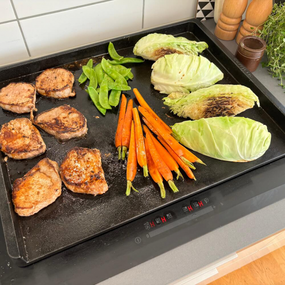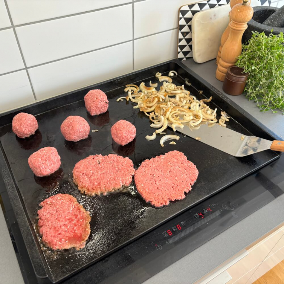 Stekbord King tar din matlagning till nästa nivå, oavsett om du vill smasha hamburgare eller steka grönsaker. Den generösa stekytan täcker alla fyra spisplattorna på en vanlig spishäll (60 cm), och med individuellt styrbara plattor kan du skapa olika temperaturzoner för effektiv matlagning.