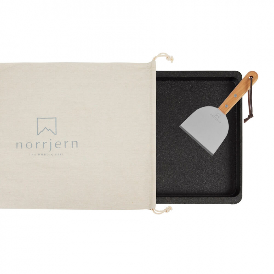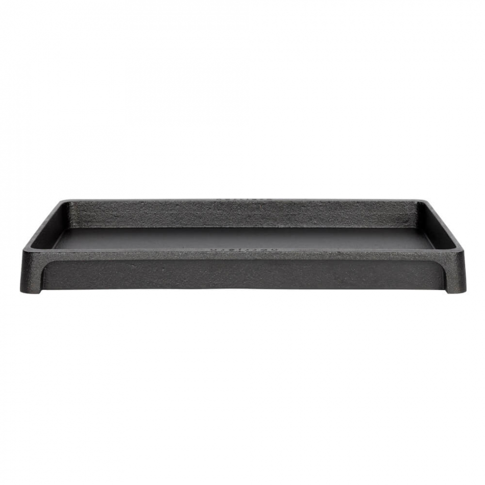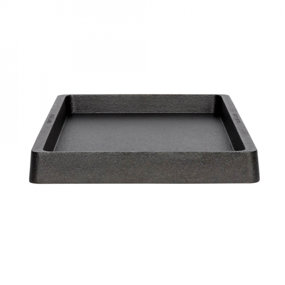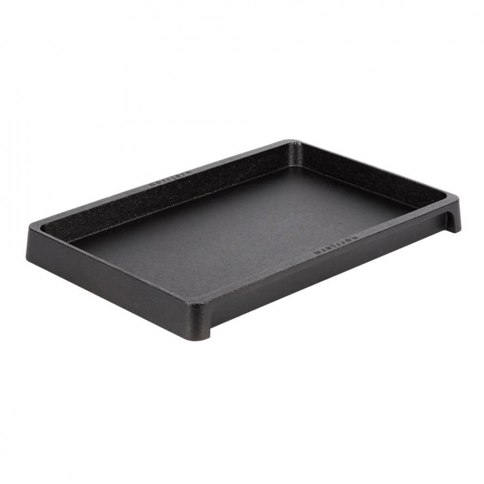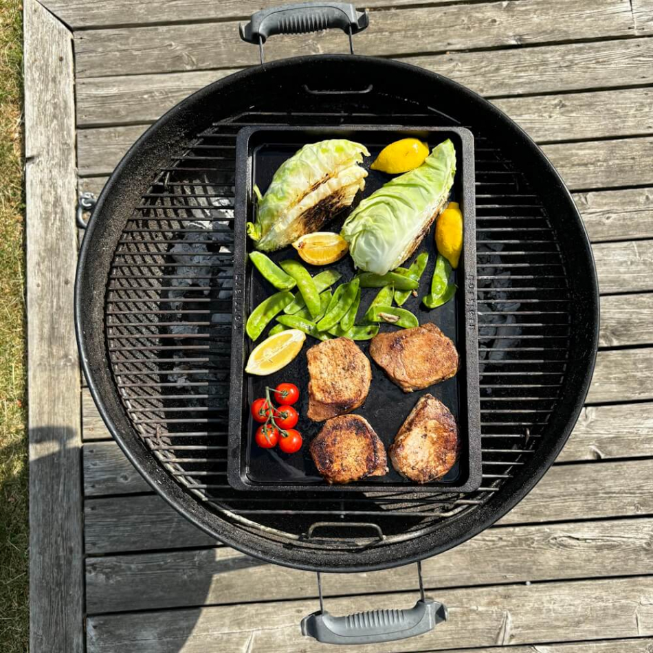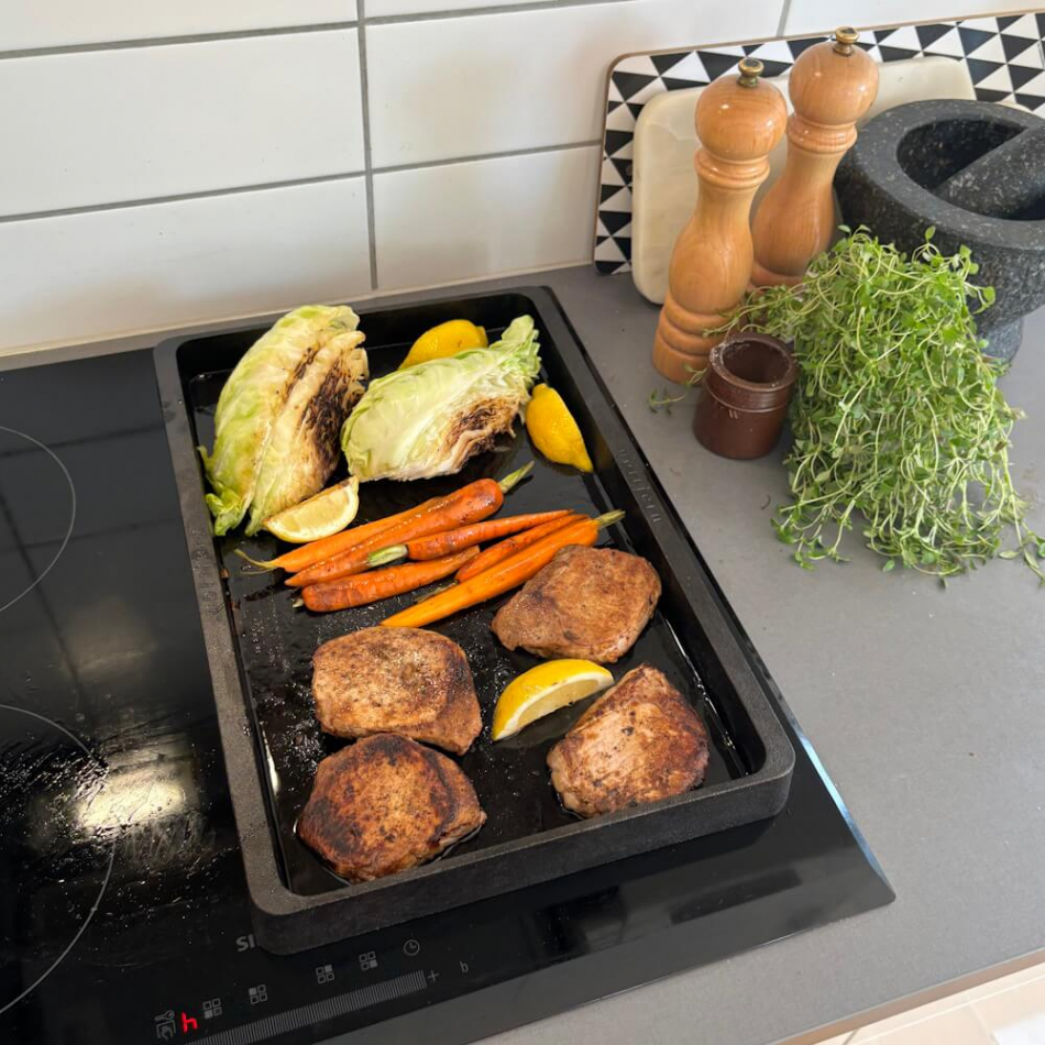Stekbordet passar perfekt över två spisplattor, vilket ger möjlighet att steka på ena halvan och använda den andra för t.ex värmehållning. Stekbordet kan även flyttas direkt från spisen till ugnen och fungerar utmärkt som serveringsfat, vilket håller maten varm vid servering. Dess stilrena design utan utstickande handtag gör det både snyggt och platsbesparande, särskilt i ugnen eller på grillen.