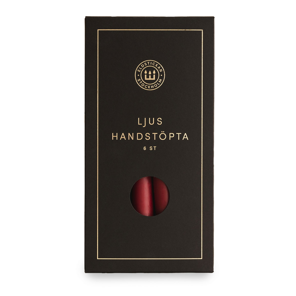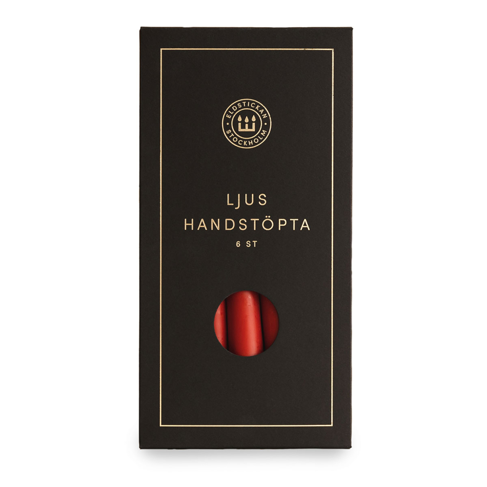 Vi är mycket stolta över Eldstickans egna handstöpta ljus som precis som våra stickor finns i flera olika kulörer, elegant förpackade i mattsvart pappask med guldprägling. Våra Röda Ljus är tillverkade i Sverige.