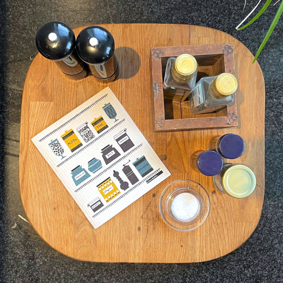 Svensktillverkad disktrasa med fina mönstret Syltburkar av Studio Almedahls