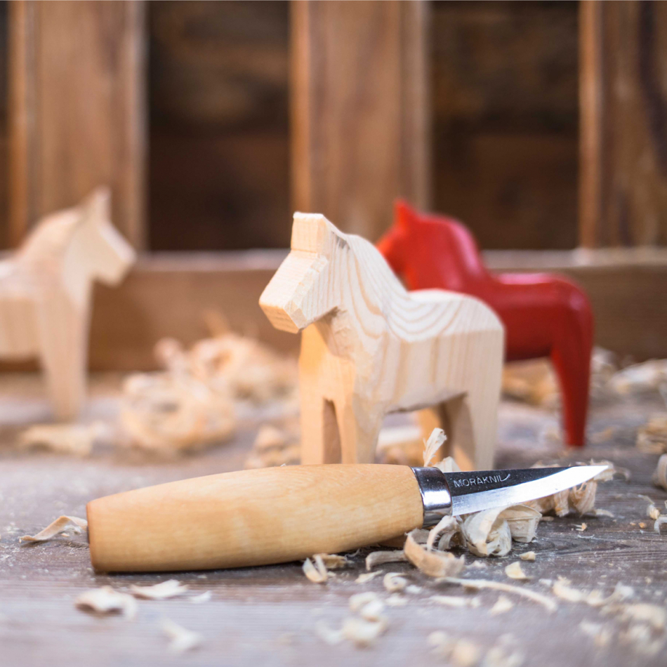 Täljkitet innehållande en klassisk slöjdkniv nr 120 och ett dalahästämne. Kniven har ett smalt och spetsigt knivblad i laminatstål, som gör den enkel att arbeta med och en god eggbeständighet. Det spolformade skaftet är gjort av oljad björk, vilket ger en härligt naturlig känsla.