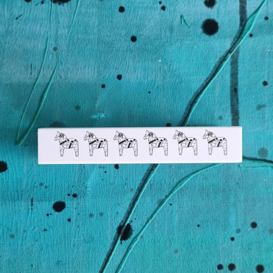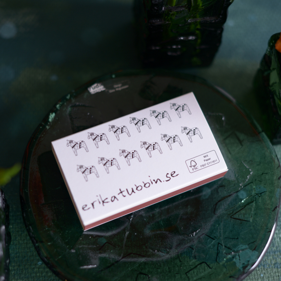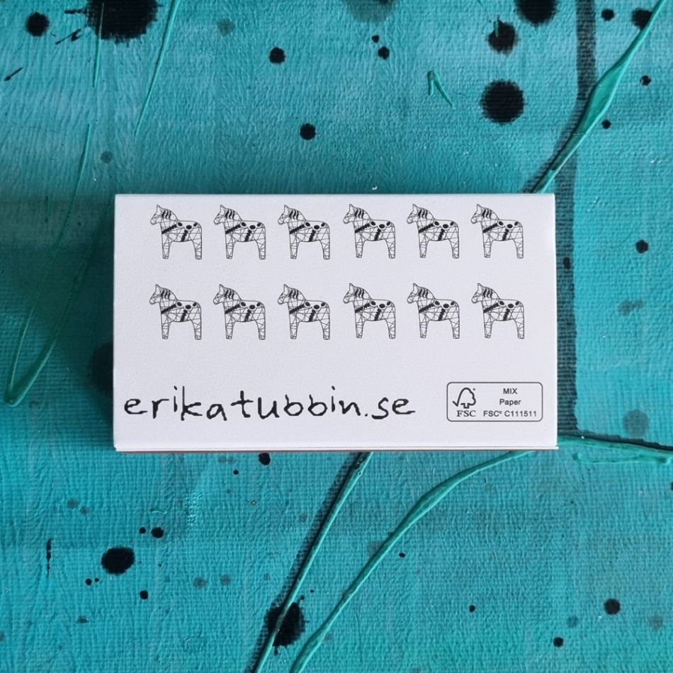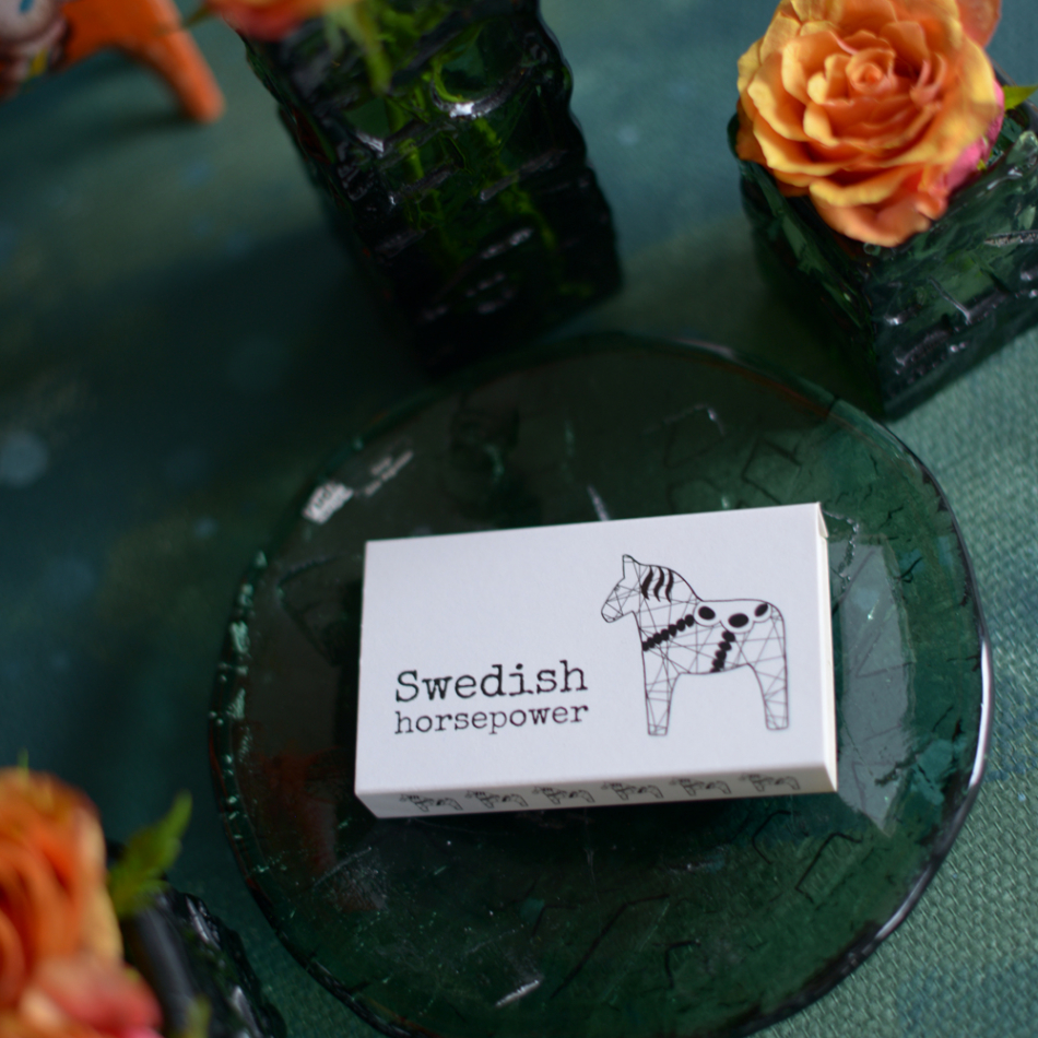 En fin tändsticksask med text: Text: "Swedish horsepower". Ca 48 långa tändstickor med svart huvud.
