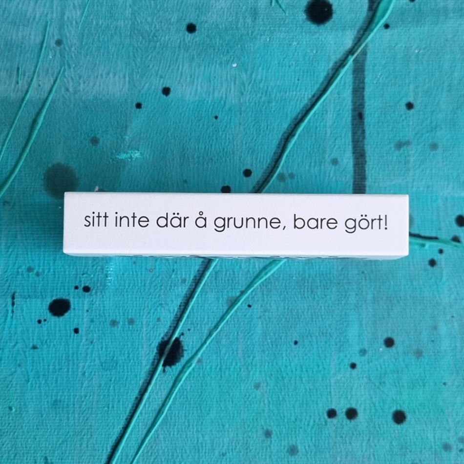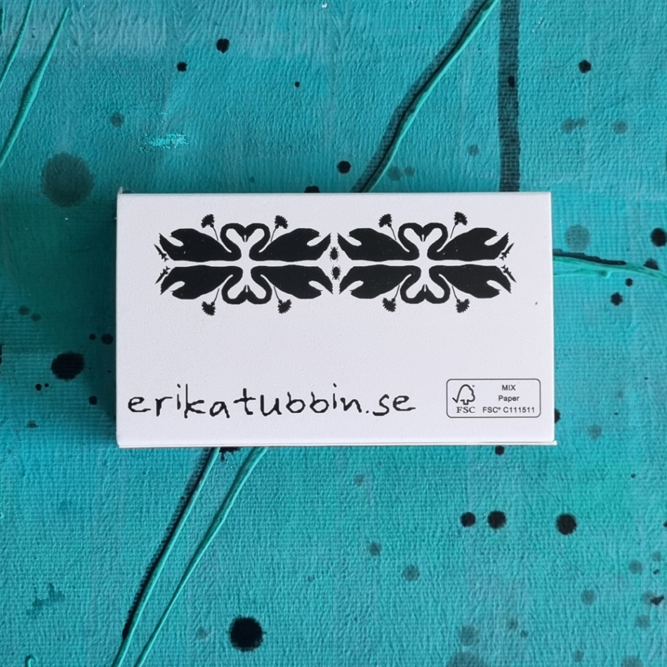 En fin tändsticksask med text: "öschötte guschelov" och på kanten: "sitt inte där å grunne, bare gört!" Ca 48 långa tändstickor med svart huvud. Tillhör erika tubbins kollektion ÖSCHÖTTE GUSCHELOV.