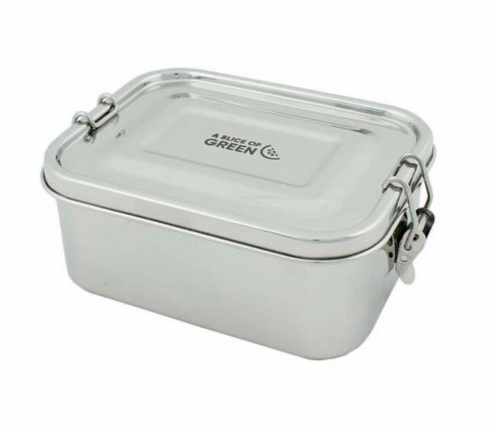 Den här matlådan kommer från A slice of Green som gör klassiska rostfria matlådor i olika former och storlekar. Helt fria från plast med smarta lås som gör att locket sitter ordentligt på plats. Locket är också utrustat med en silikonpackning för att förhindra läckage. Packningen kan tas loss och diskas separat. Hela matlådan kan köras i diskmaskin.