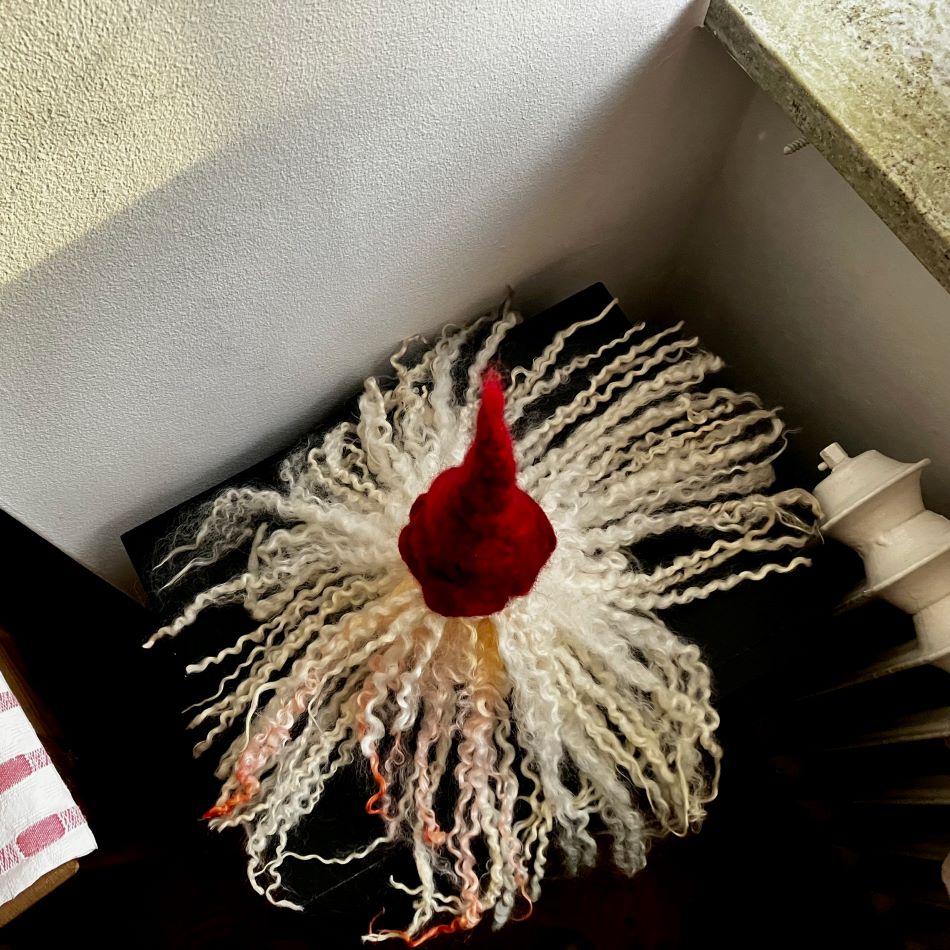 Handgjord tomte med röd luva. Nålfiltad kropp och luva i svensk ull, långa lockar av teeswaterfår. Varje tomte blir ej exakt lika varandra utan du får ett unikt exemplar. Hustomten väger cirka 80 gram och är kropp till luva är 27 cm. Lockarna är cirka 20 cm långa. Tips är att ställa tomten på en ljusstake eller vas för att få till lockarnas vackra fall. Design Nettans Ullisar