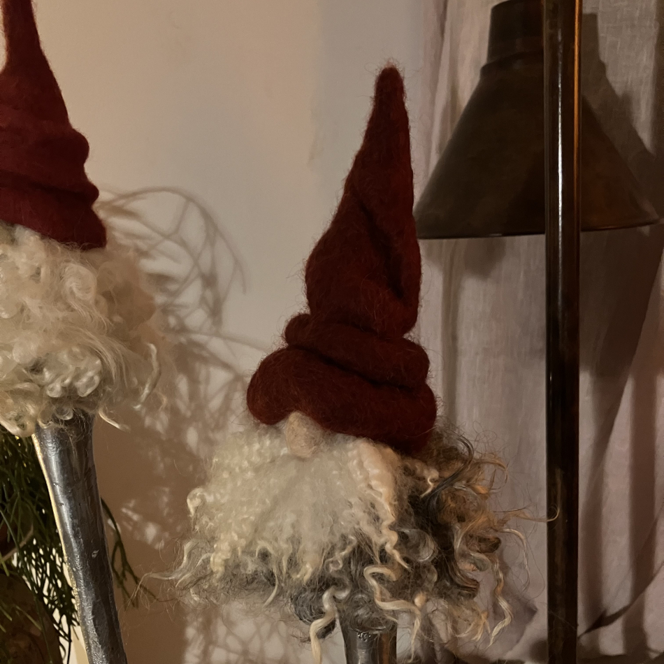 Hustomte nålfiltad i ull med röd luva och lockar från gotlandsfår och finull.