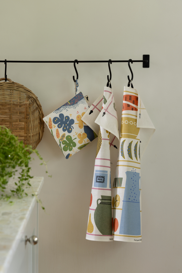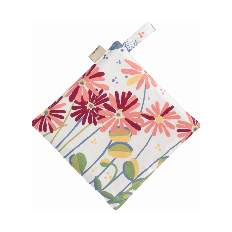 Grytlappen är vadderad för extra värmeskydd, lätt att hantera och försedd med ögla för enkel upphängning. Den passar perfekt tillsammans med förkläde och andra kökstextilier i samma serie.