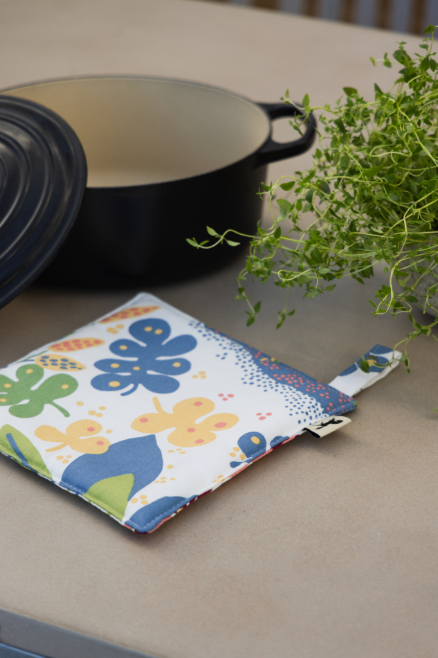 Mönstret är tryckt på grytlappens fram- och baksida med 90 cm mönsterrapport. Varje enskild grytlapp är unik och mönstrets placering varierar mellan produkterna. Färgen kan variera mellan produktionstillfällen beroende bomullens naturliga egenskaper.