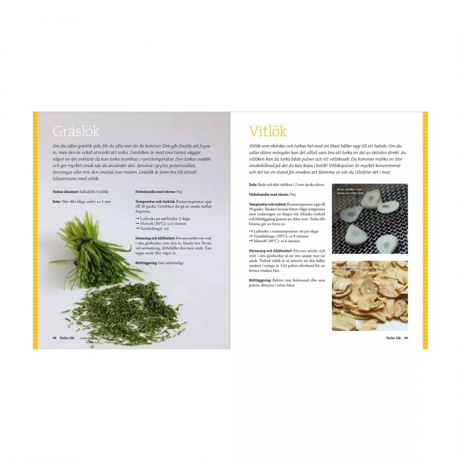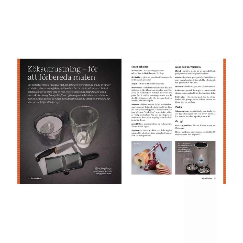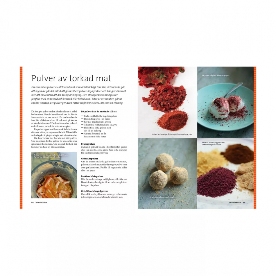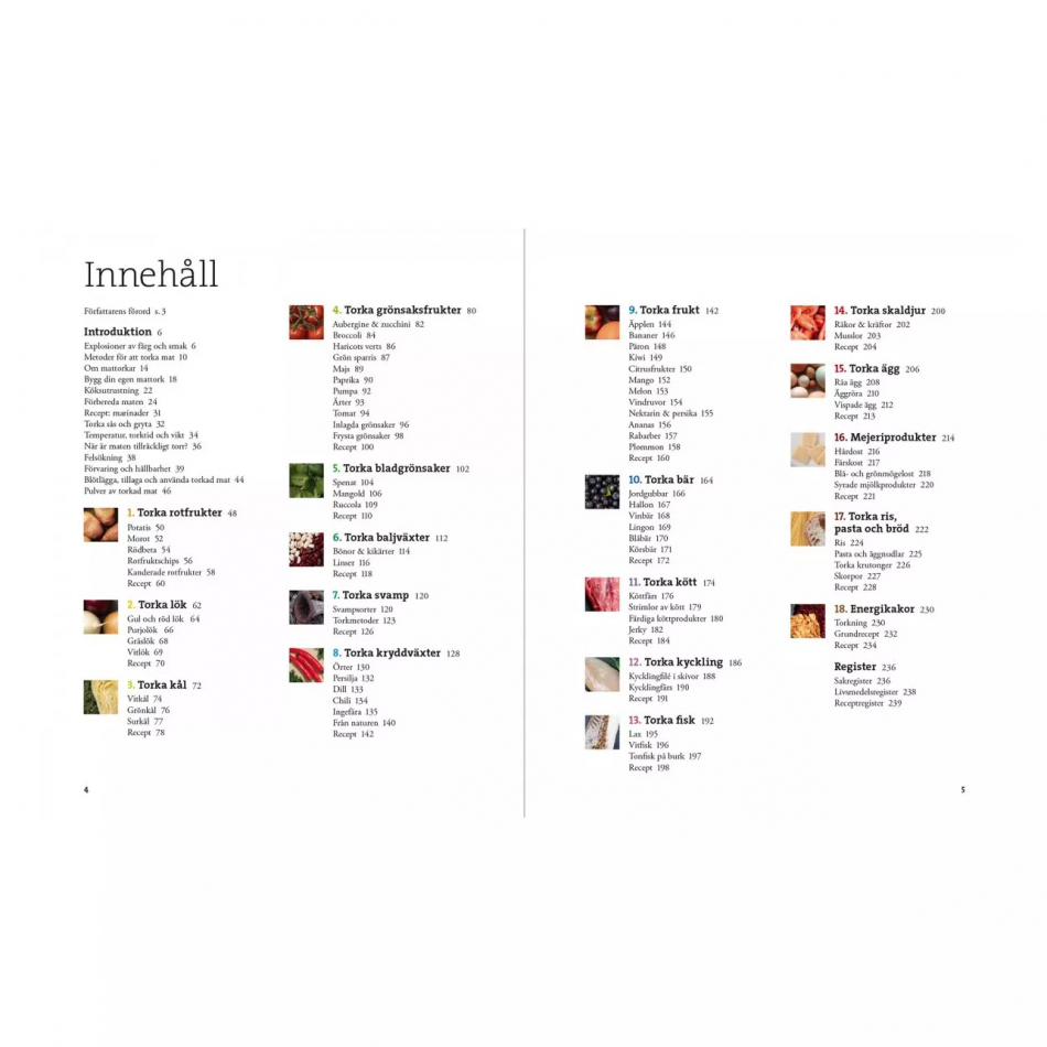 Du får veta hur du torkar enkla råvaror som frukt, rotsaker och svamp, men också mer avancerade livsmedel som fisk, ägg, kött och kyckling. Boken innehåller recept på energikakor, buljonger och egengjord jerky. Ett helt kapitel ägnas åt olika typer av mattorkar.