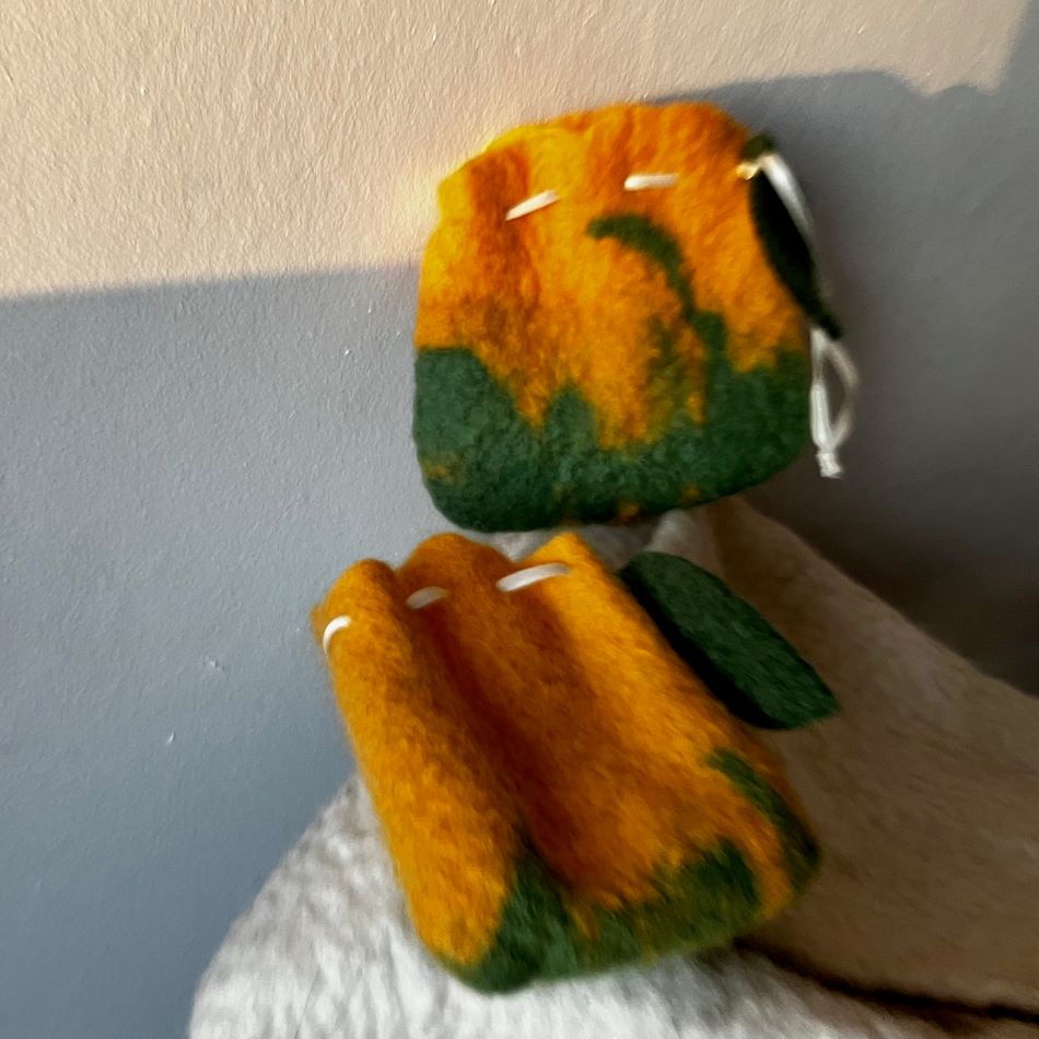 Handgjord våttovad liten förvaringsväska för smycken, småsaker. Häng den på din lite större väska eller varför inte sätta en liten glaskruka i och använd som vas med vackra blommor i. Ullen är av merinoull design Nettans Ullisar. Ingen påse är den andra lik men färgerna är gul och med grön dekoration. Påsen stängs med ett sidenband och stopper är en tovat blad. Cirka mått längd 12 cm och bredaste 10 cm väger cirka 12 gr.