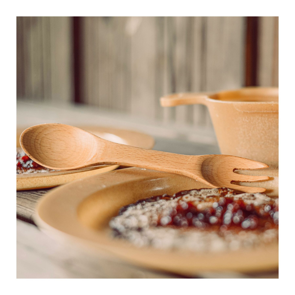 En kombinerad sked och gaffel i trä för måltiden utomhus.