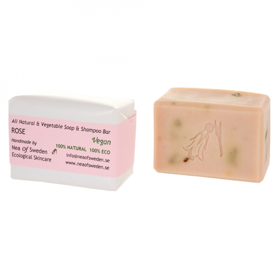 Vegan-vänlig tvål & schampoo kaka med rosengeranium och ylangolja. Innehåller rosenblad.