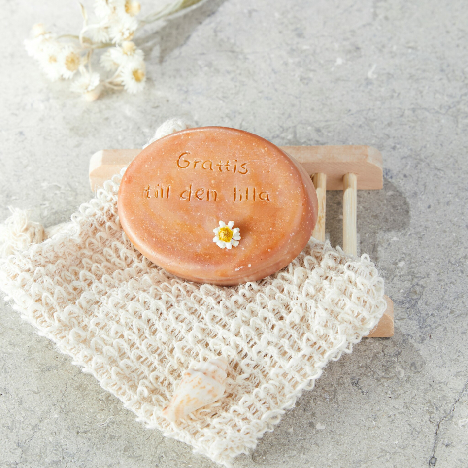 Skrubbtvålen skrubbar bort döda hudceller med hjälp av aprikoskärnmjöl.