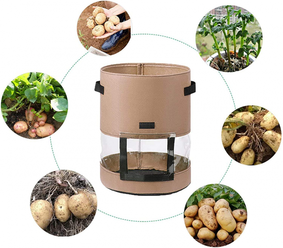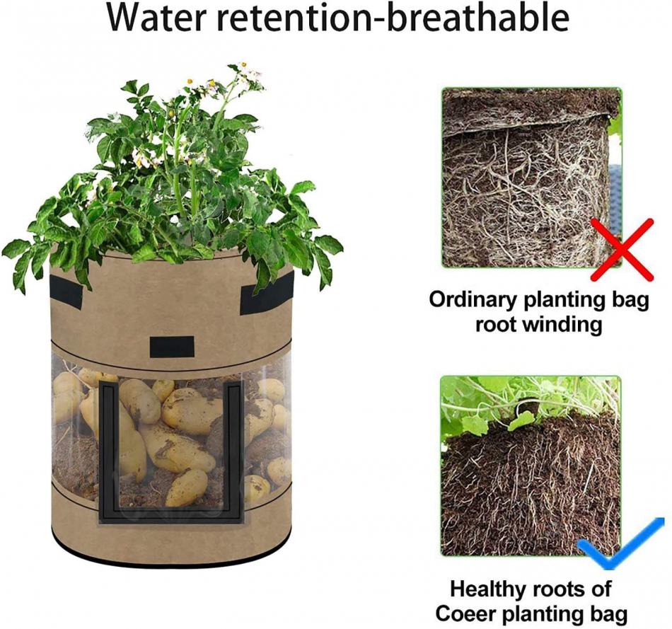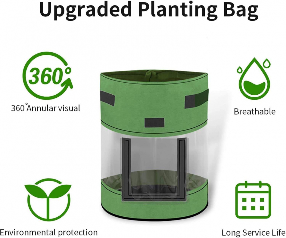 - Unik design: botten av potatis-planteringspåsen har en cirkel med transparent film och den bifogade skugg- och värmeisolerande trasan, med hänsyn till observationen av grönsaksplantering och tillväxt och skyddar plantans hälsosamma tillväxt. Med ett transparent visualiseringsfönster är det lättare att skörda grönsaker.