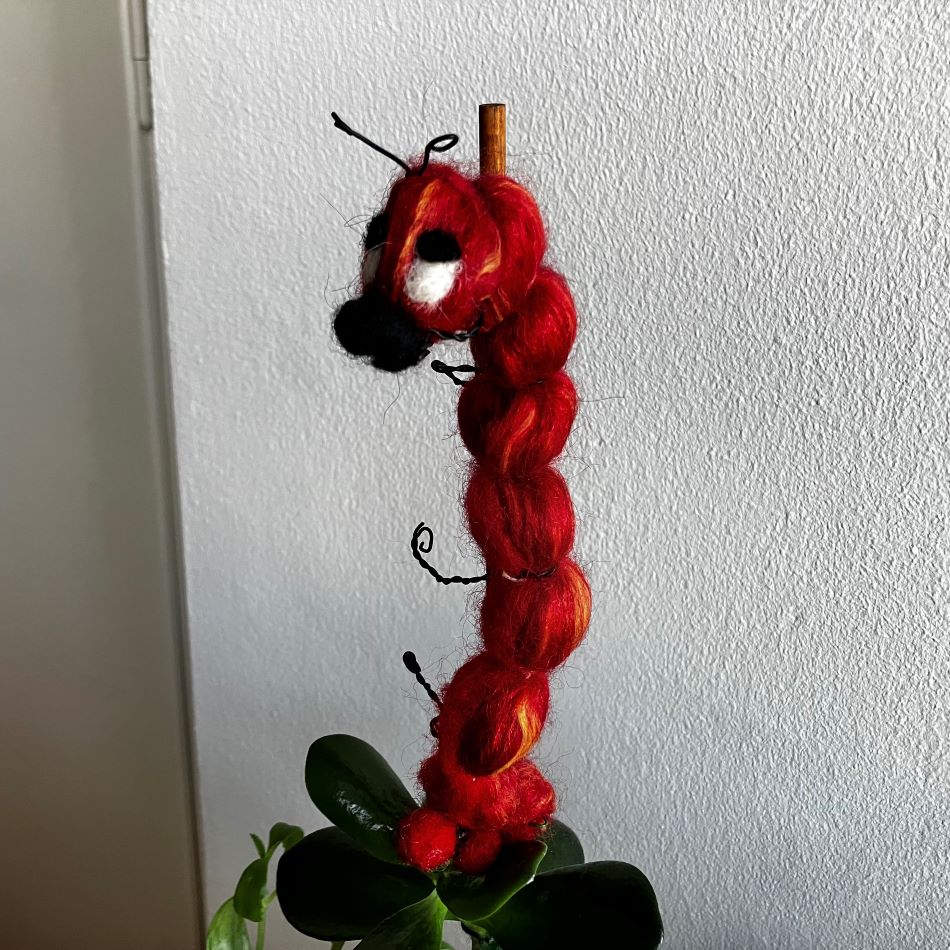 En rolig ulldekoration med stålvajer i kroppen så du kan sätta den i olika positioner. Dekorera på krukor, blompinnar, sätta på väggen, lampor. Ja- (eller använd sidenbandet som kommer med till att ha som bokmärke) vad du vill. Handgjord av @nettansullisar. Ej leksak. Längd ca 20 cm. Ullen är från merinofår.